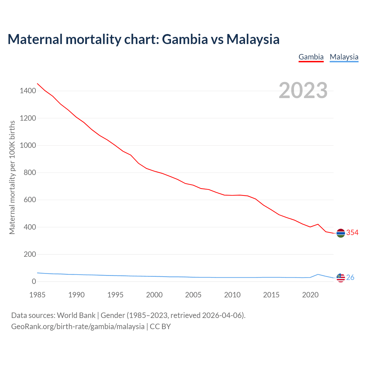 The maternal mortality rate, which is the probability of dying during childbirth or within 42 days of pregnancy termination, is 354 deaths per 100,000 live births in the Gambia, compared to 26 deaths in Malaysia.