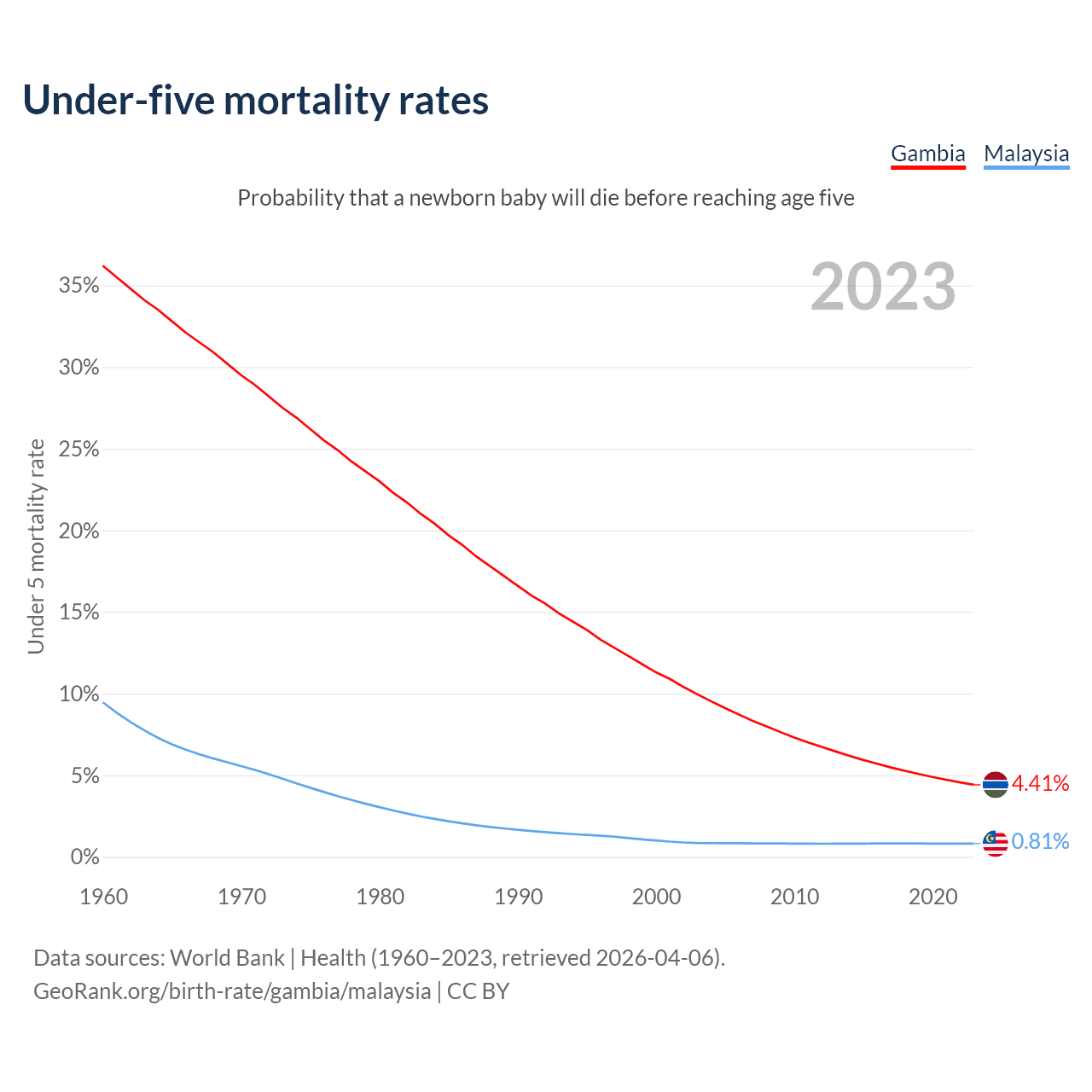 The chance that a newborn baby will die before reaching age five is 4.41% in the Gambia and 0.81% in Malaysia. Above is a chart with historical data on under-five mortality rates.