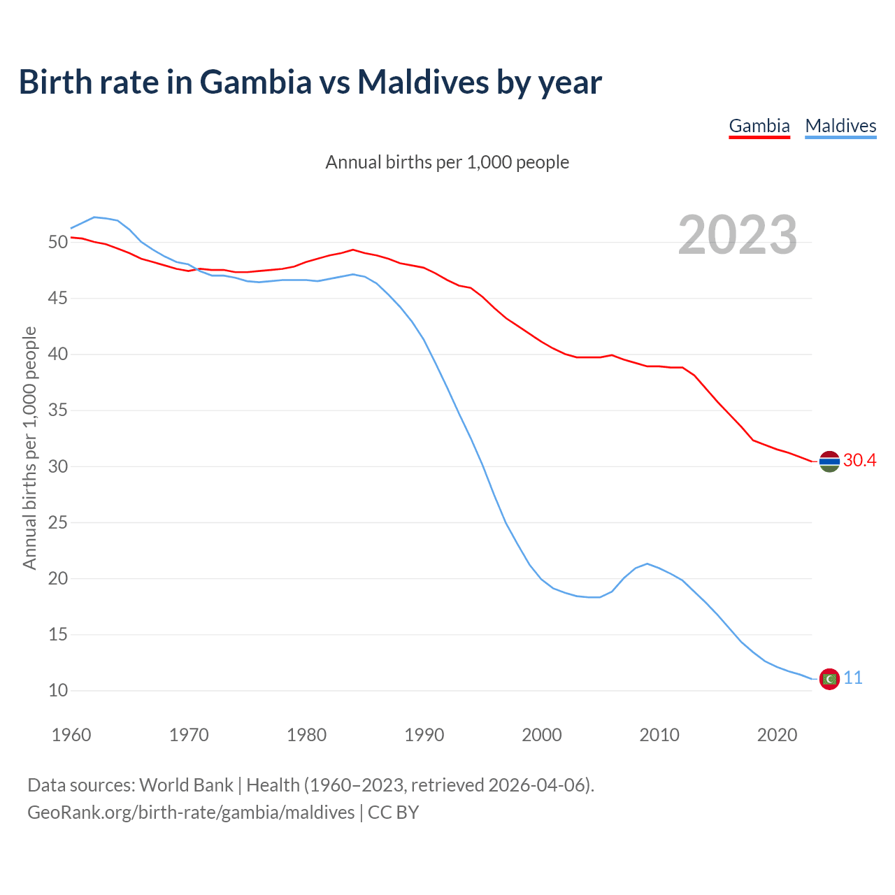 The Gambia has an annual birth rate of 30.4 births per 1,000 people, compared to 11 for Maldives. The average number of children a woman is expected to have during her lifetime — the fertility rate, is 4.01 in the Gambia and 1.58 in Maldives — 60.7% difference.