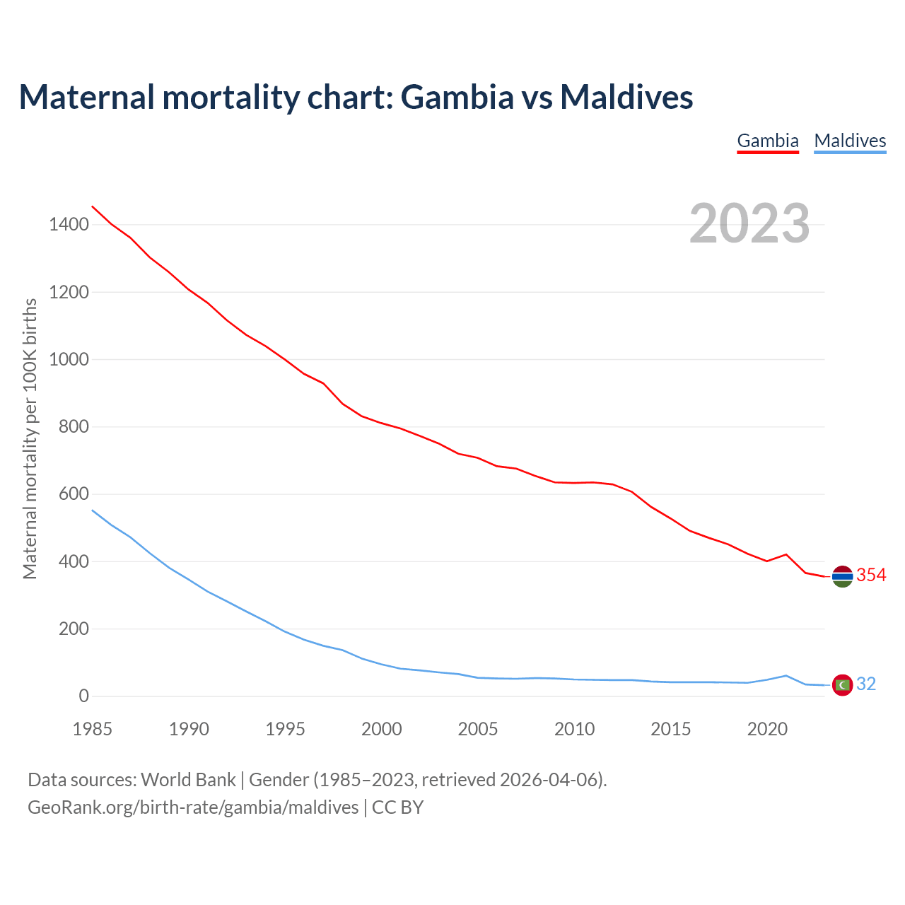 The maternal mortality rate, which is the probability of dying during childbirth or within 42 days of pregnancy termination, is 354 deaths per 100,000 live births in the Gambia, compared to 32 deaths in Maldives.