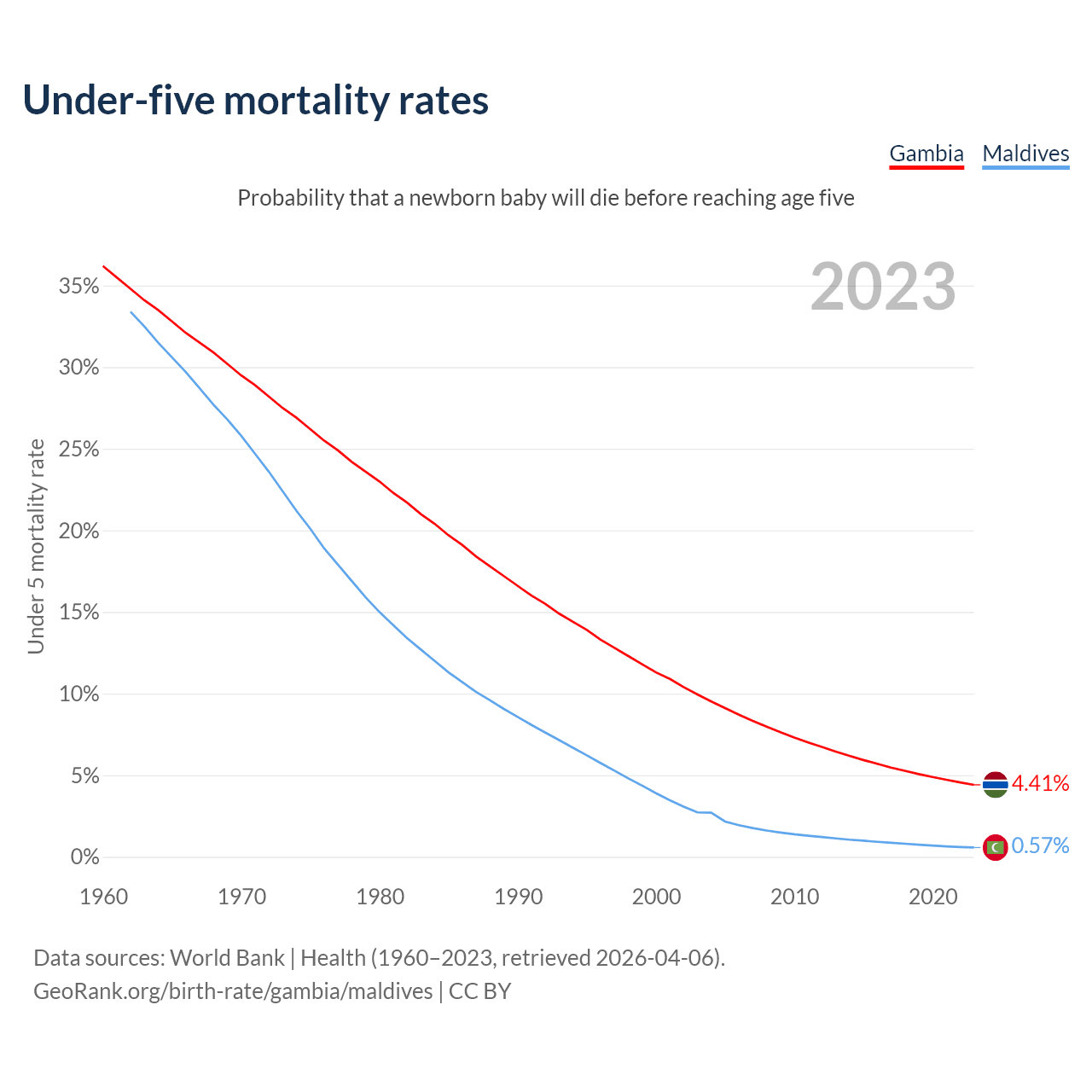 The chance that a newborn baby will die before reaching age five is 4.41% in the Gambia and 0.57% in Maldives. Above is a chart with historical data on under-five mortality rates.