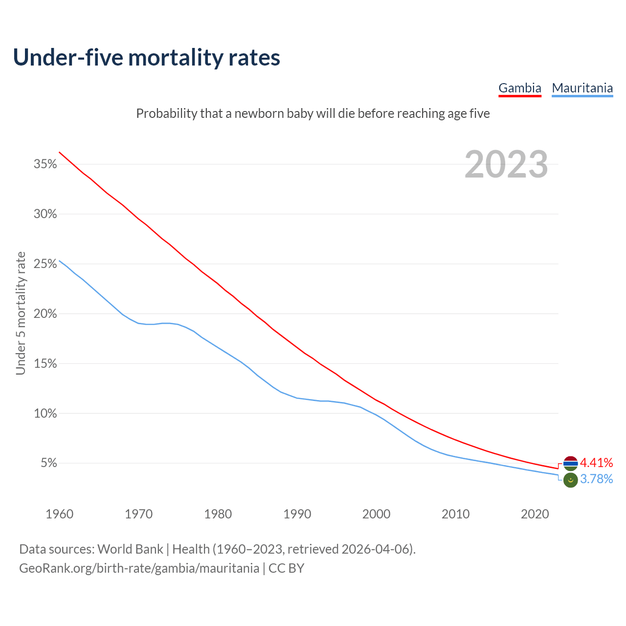 The chance that a newborn baby will die before reaching age five is 4.41% in the Gambia and 3.78% in Mauritania. Above is a chart with historical data on under-five mortality rates.