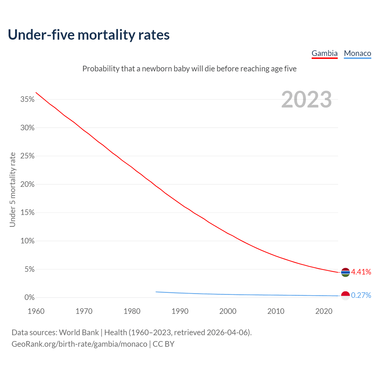 The chance that a newborn baby will die before reaching age five is 4.41% in the Gambia and 0.27% in Monaco. Above is a chart with historical data on under-five mortality rates.