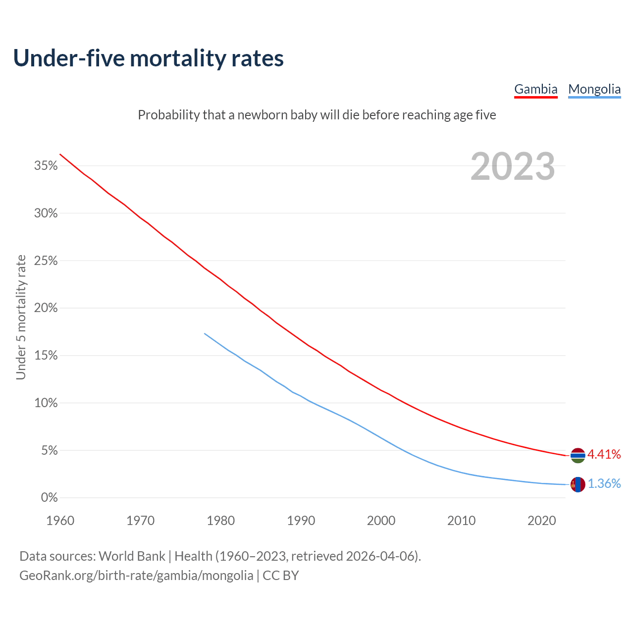The chance that a newborn baby will die before reaching age five is 4.41% in the Gambia and 1.36% in Mongolia. Above is a chart with historical data on under-five mortality rates.