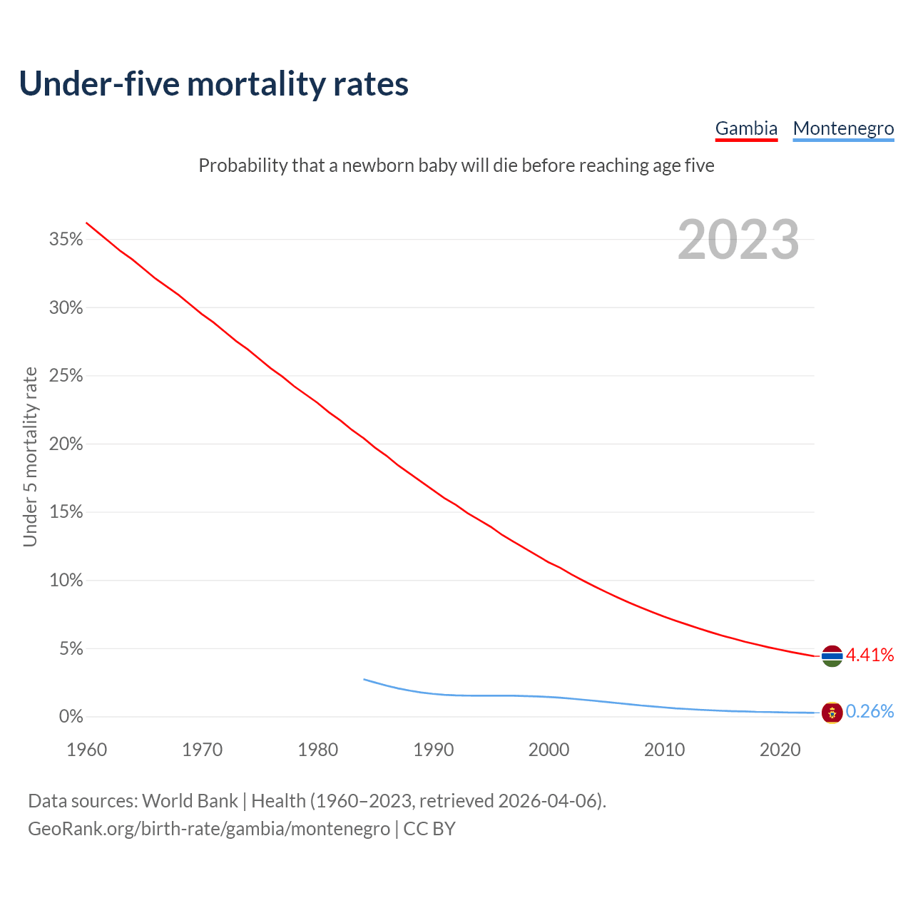 The chance that a newborn baby will die before reaching age five is 4.41% in the Gambia and 0.26% in Montenegro. Above is a chart with historical data on under-five mortality rates.