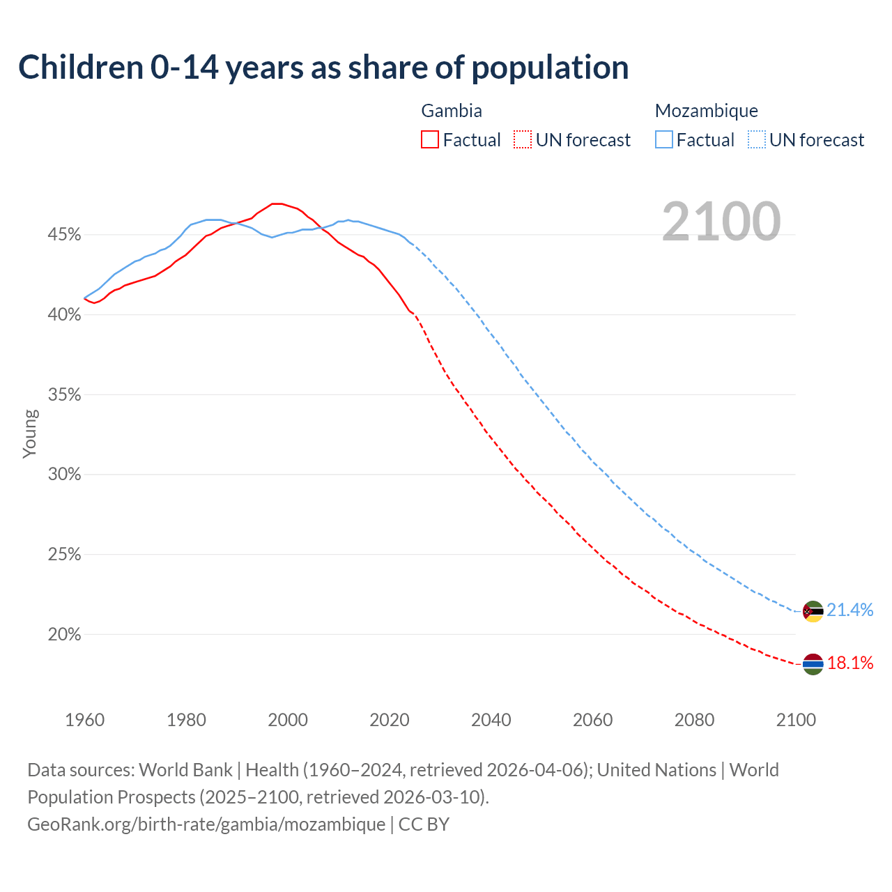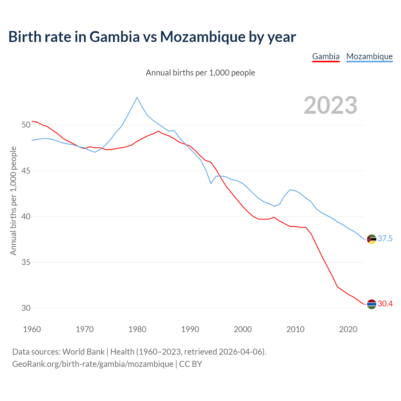 According to the latest available data on birth rates, the fertility rate in the Gambia was 4.01 children per woman in 2023, compared to 4.76 in Mozambique in 2023. The replacement level is considered to be 2.1 children per woman.