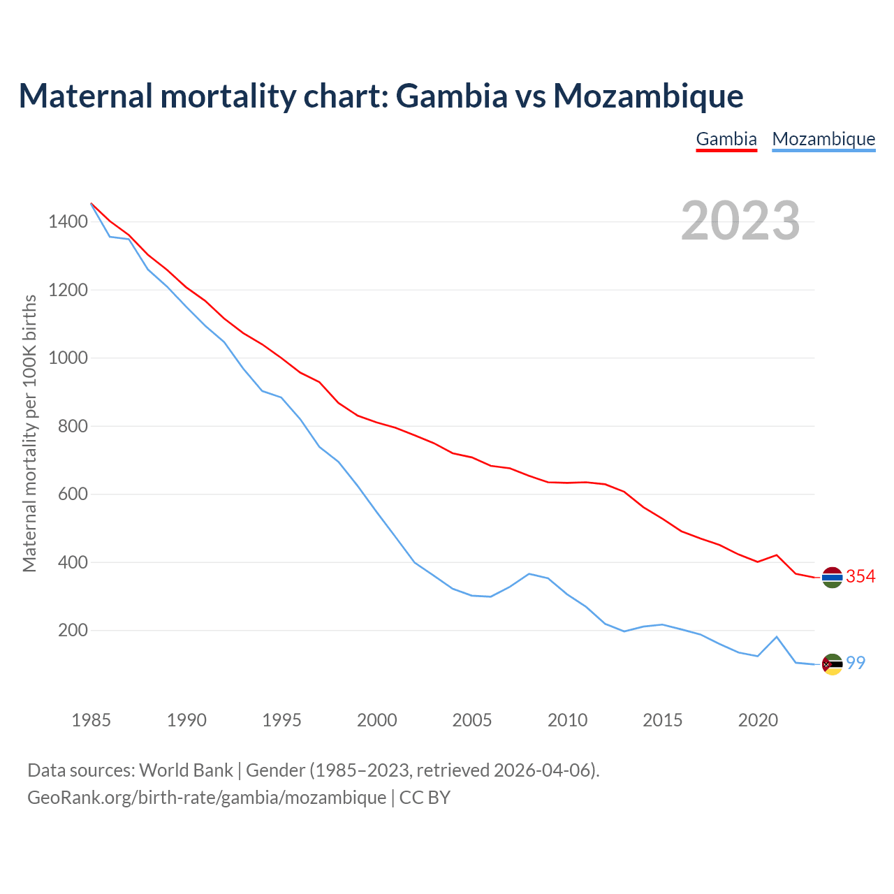 The maternal mortality rate, which is the probability of dying during childbirth or within 42 days of pregnancy termination, is 354 deaths per 100,000 live births in the Gambia, compared to 99 deaths in Mozambique.
