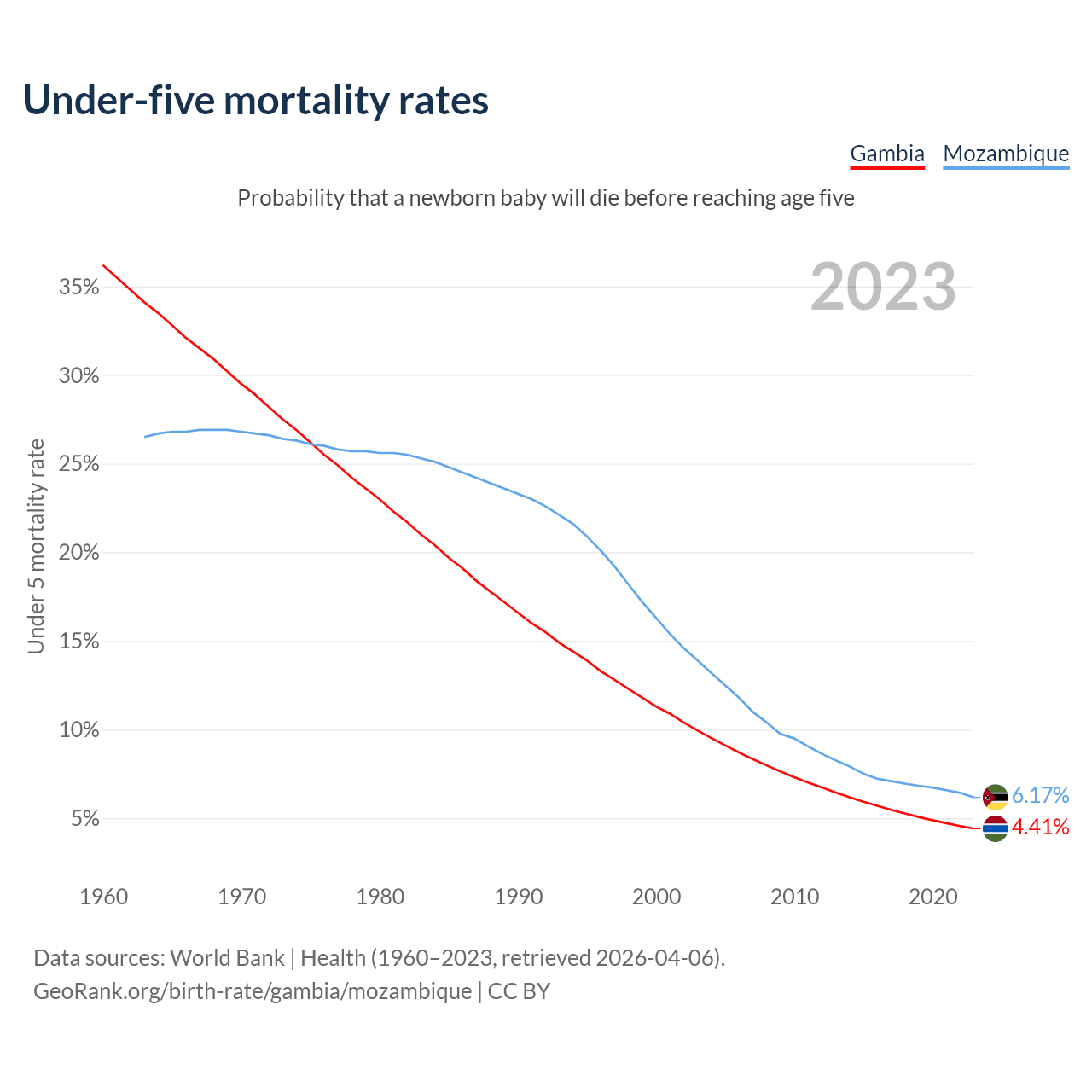 The chance that a newborn baby will die before reaching age five is 4.41% in the Gambia and 6.17% in Mozambique. Above is a chart with historical data on under-five mortality rates.