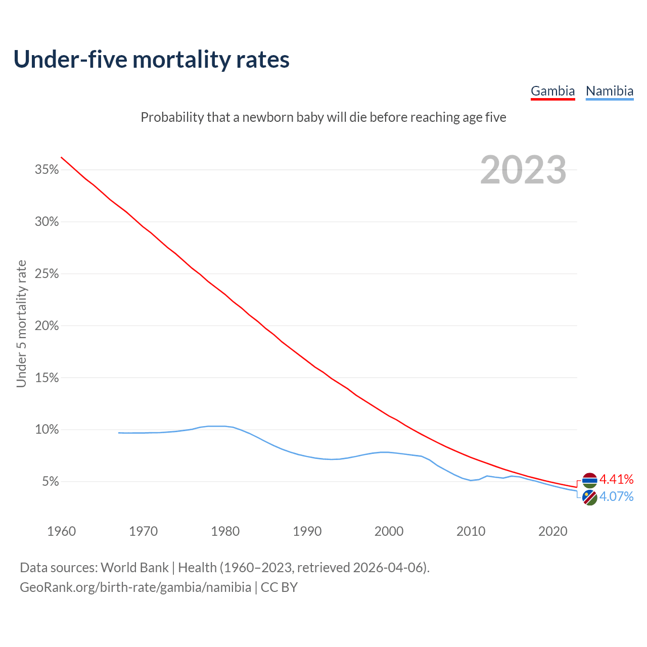 The chance that a newborn baby will die before reaching age five is 4.41% in the Gambia and 4.07% in Namibia. Above is a chart with historical data on under-five mortality rates.