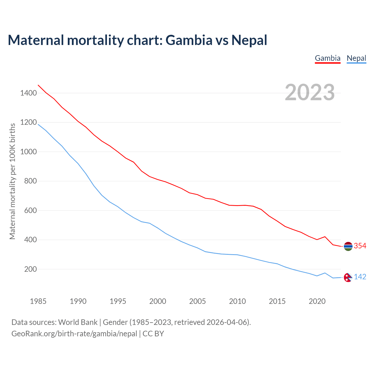 The maternal mortality rate, which is the probability of dying during childbirth or within 42 days of pregnancy termination, is 354 deaths per 100,000 live births in the Gambia, compared to 142 deaths in Nepal.