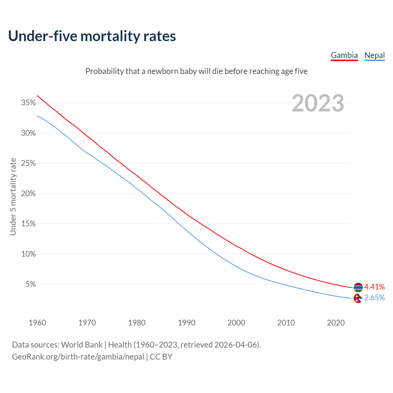 The chance that a newborn baby will die before reaching age five is 4.41% in the Gambia and 2.65% in Nepal. Above is a chart with historical data on under-five mortality rates.