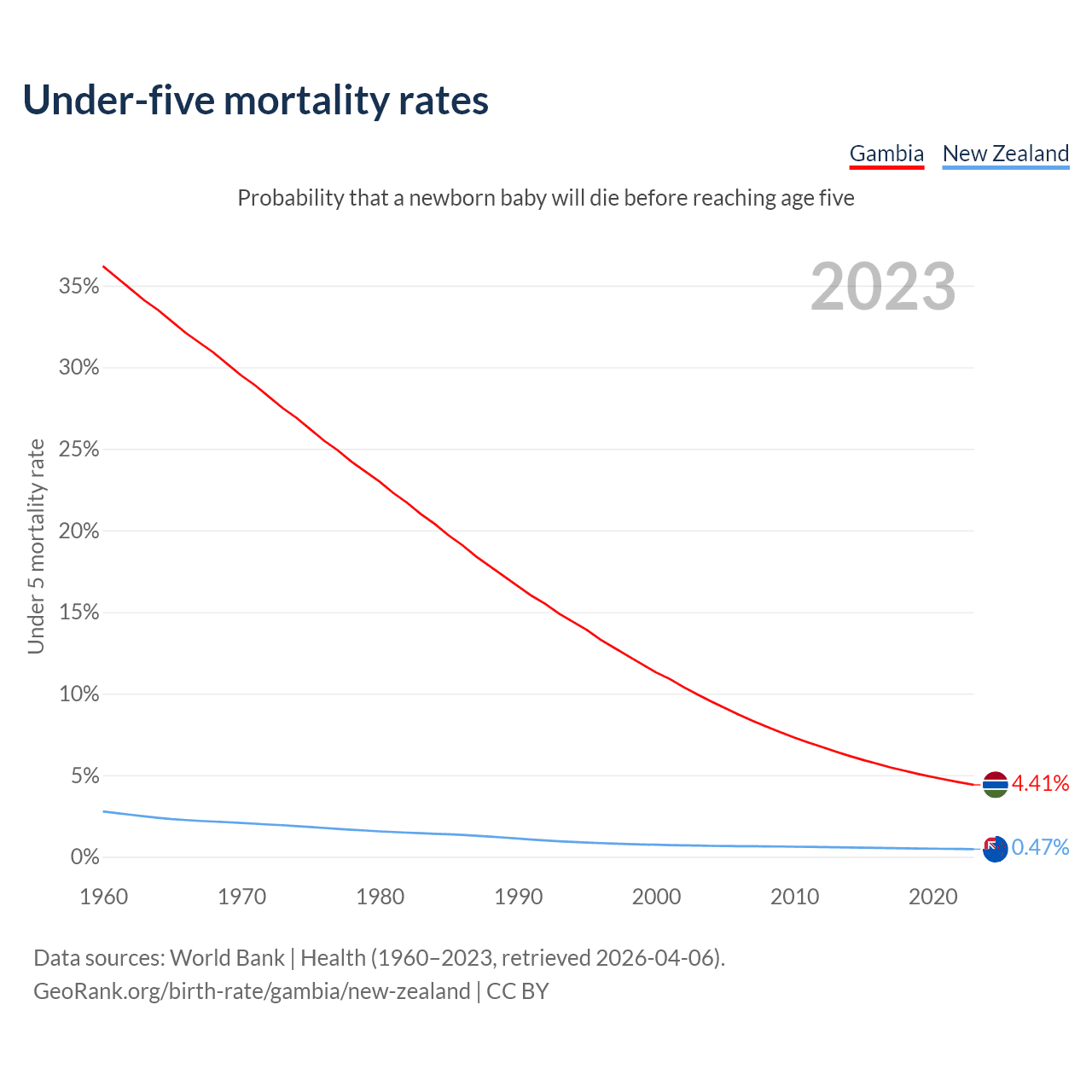 The chance that a newborn baby will die before reaching age five is 4.41% in the Gambia and 0.47% in New Zealand. Above is a chart with historical data on under-five mortality rates.