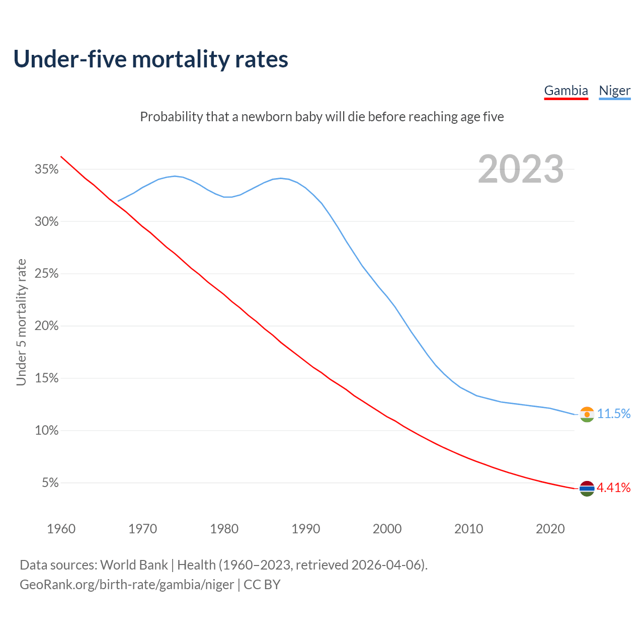The chance that a newborn baby will die before reaching age five is 4.41% in the Gambia and 11.5% in Niger. Above is a chart with historical data on under-five mortality rates.