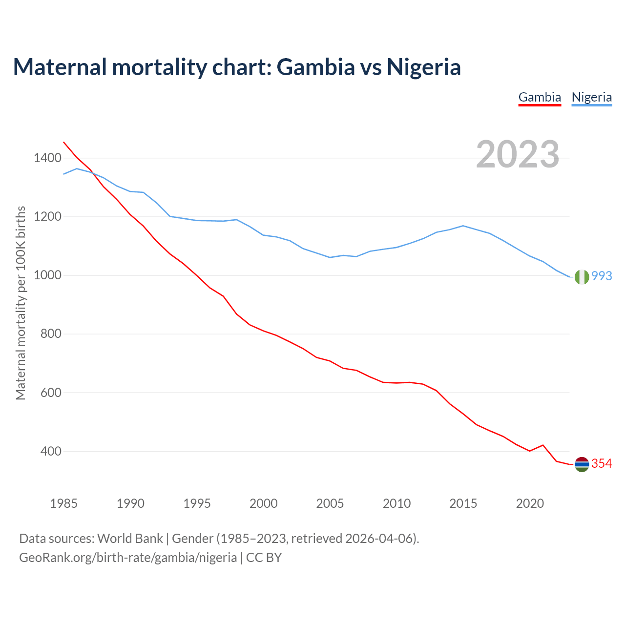 The maternal mortality rate, which is the probability of dying during childbirth or within 42 days of pregnancy termination, is 354 deaths per 100,000 live births in the Gambia, compared to 993 deaths in Nigeria.
