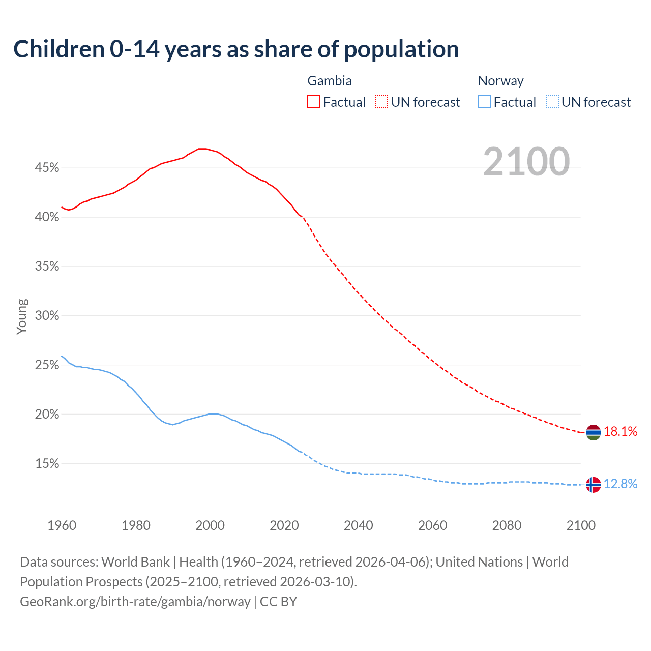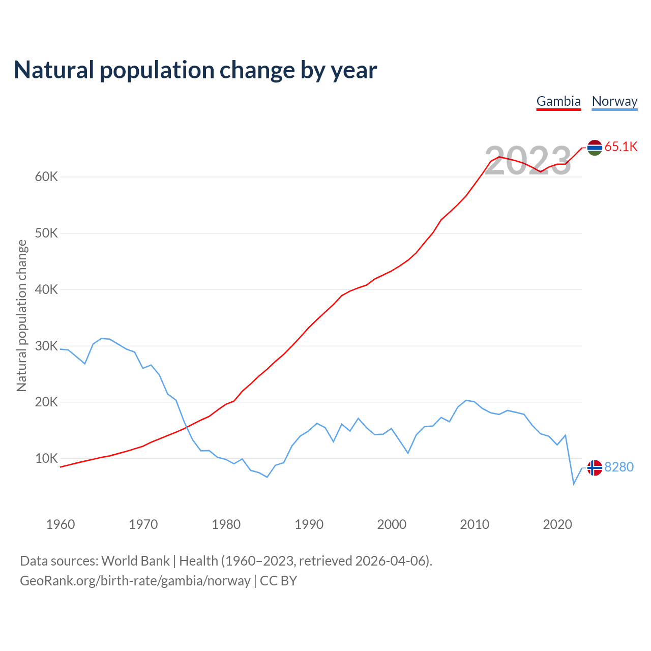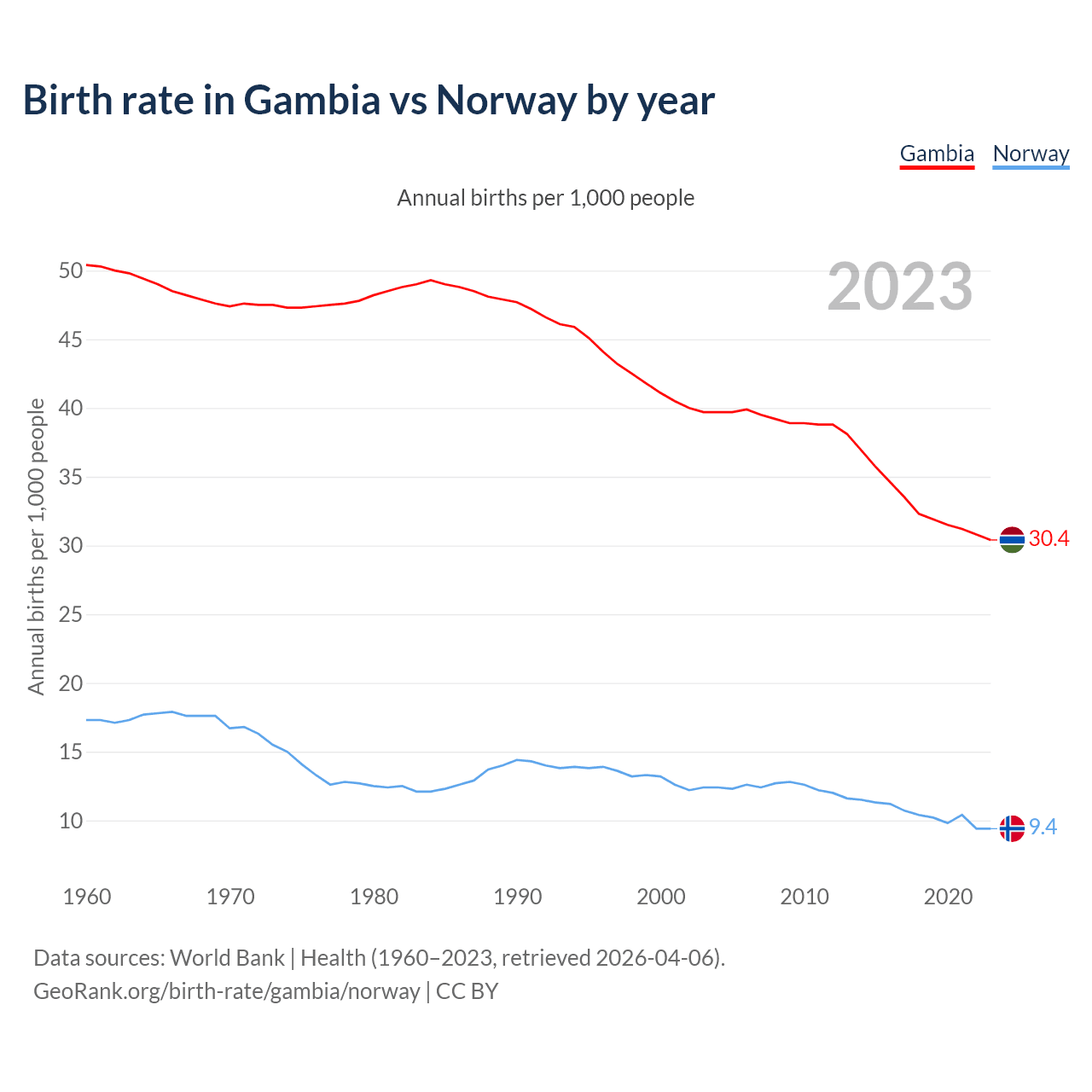 The Gambia has an annual birth rate of 30.4 births per 1,000 people, compared to 9.4 for Norway. The average number of children a woman is expected to have during her lifetime — the fertility rate, is 4.01 in the Gambia and 1.4 in Norway — 65.1% difference.