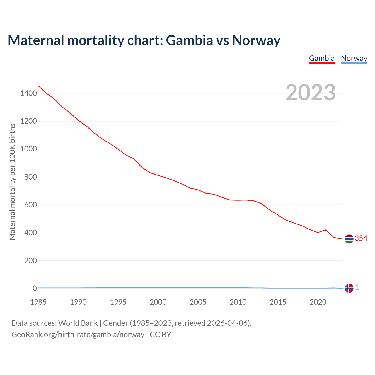 The maternal mortality rate, which is the probability of dying during childbirth or within 42 days of pregnancy termination, is 354 deaths per 100,000 live births in the Gambia, compared to 1 deaths in Norway.