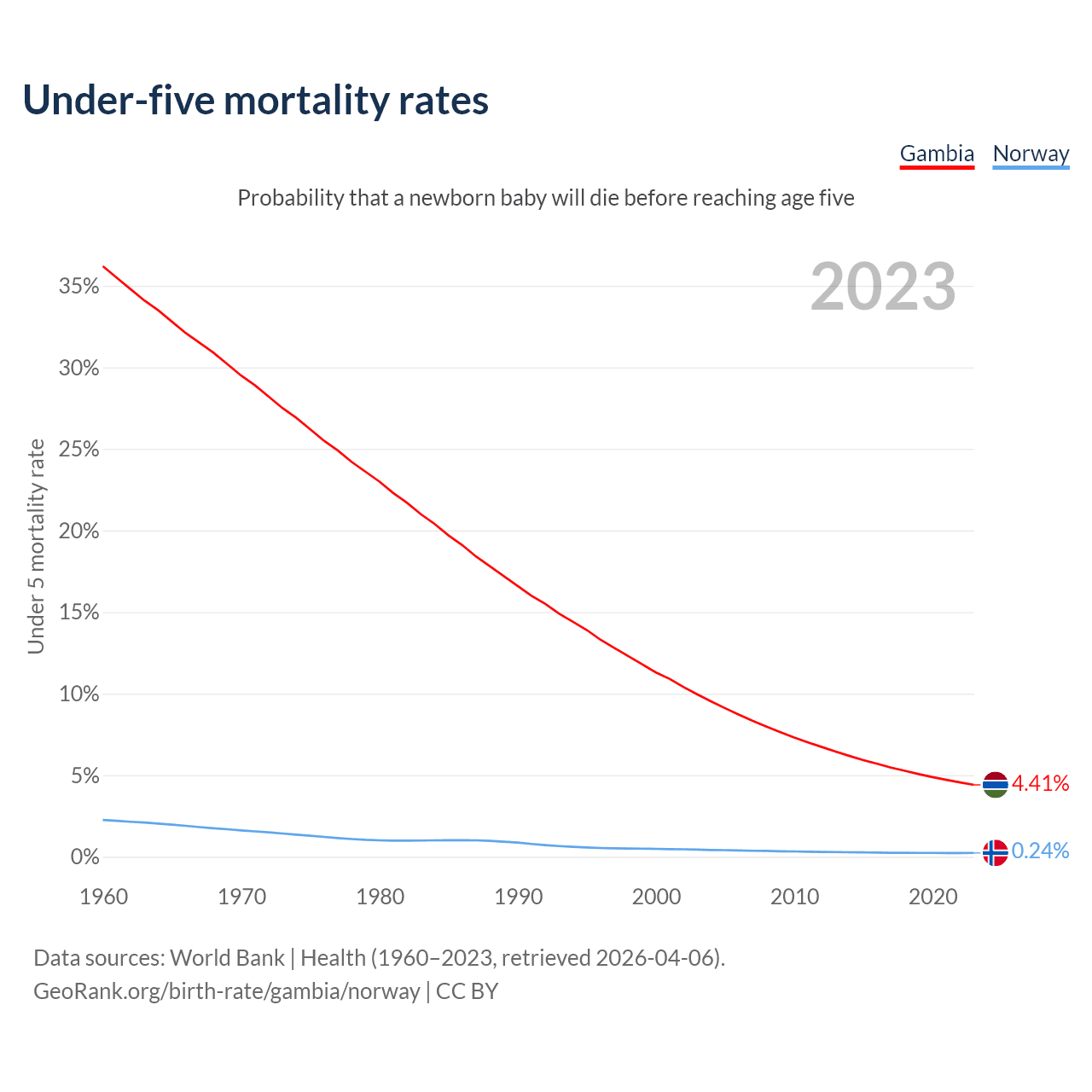 The chance that a newborn baby will die before reaching age five is 4.41% in the Gambia and 0.24% in Norway. Above is a chart with historical data on under-five mortality rates.
