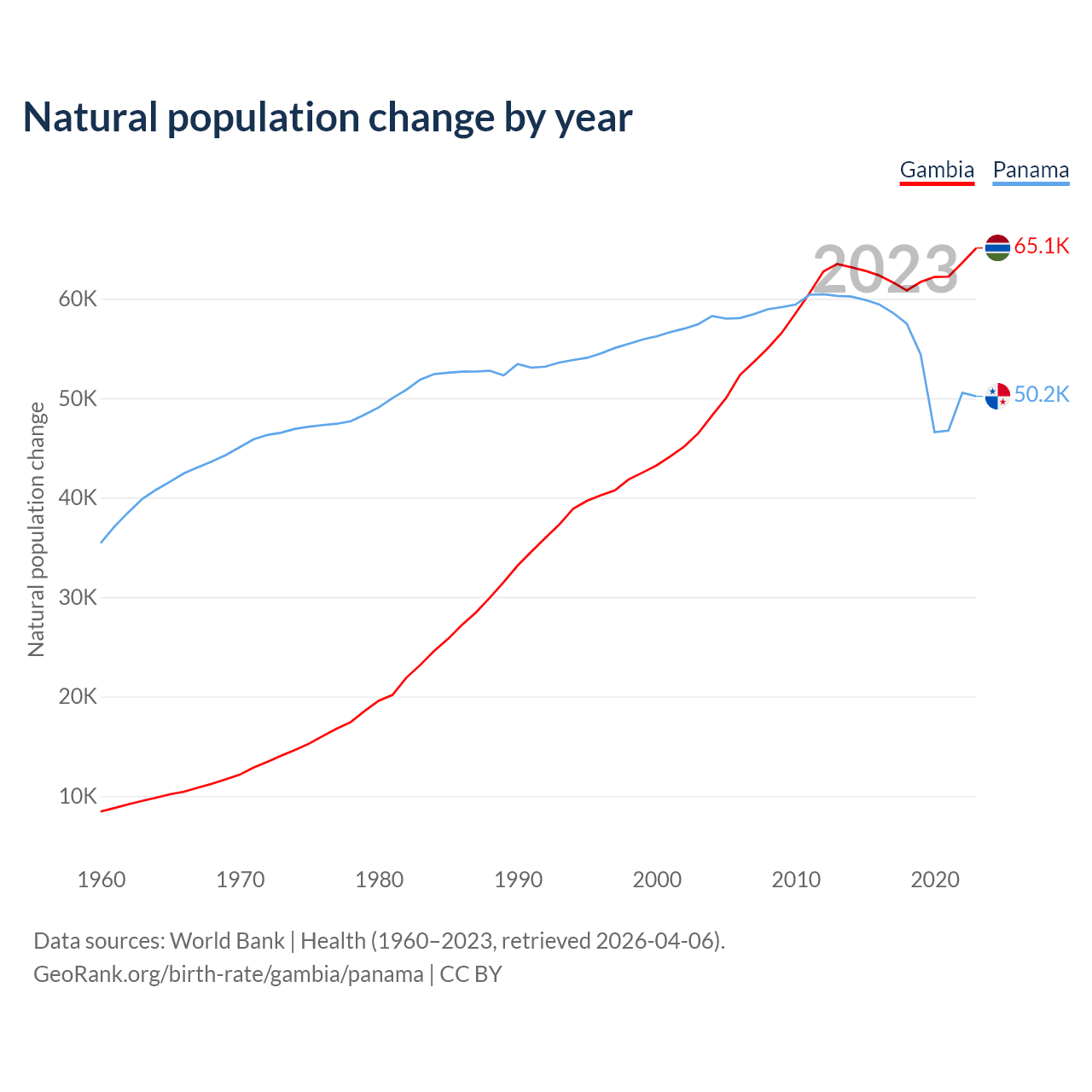 The Gambia has an annual birth rate of 30.4 births per 1,000 people, compared to 16 for Panama. The average number of children a woman is expected to have during her lifetime — the fertility rate, is 4.01 in the Gambia and 2.12 in Panama — 47.1% difference.