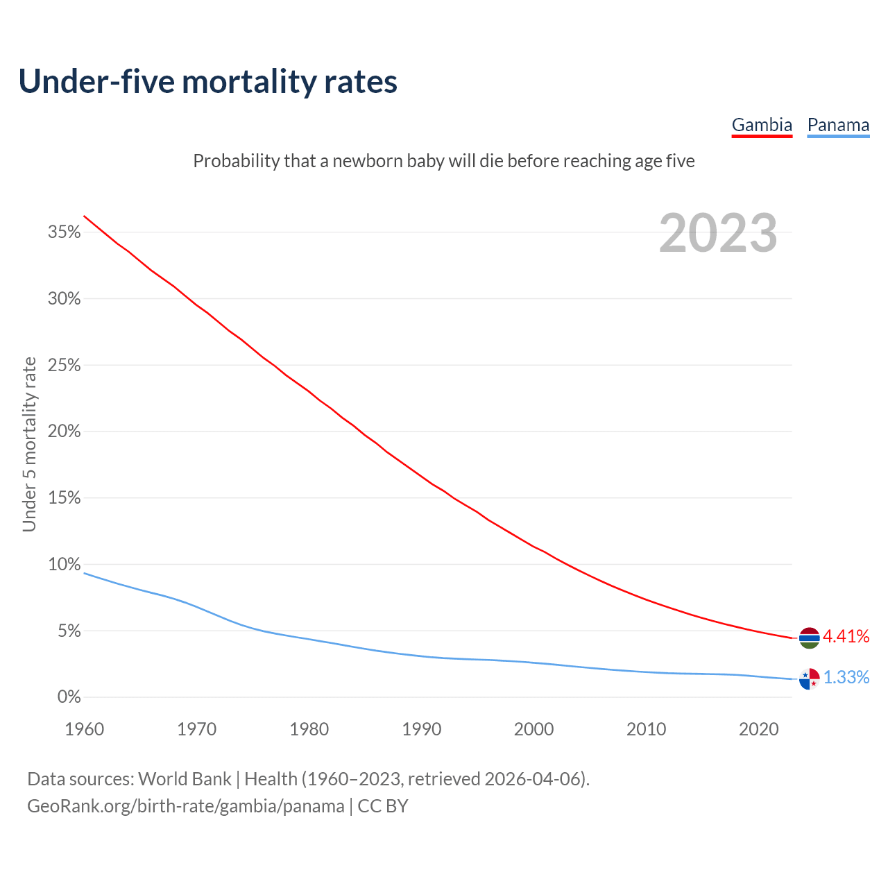 The chance that a newborn baby will die before reaching age five is 4.41% in the Gambia and 1.33% in Panama. Above is a chart with historical data on under-five mortality rates.