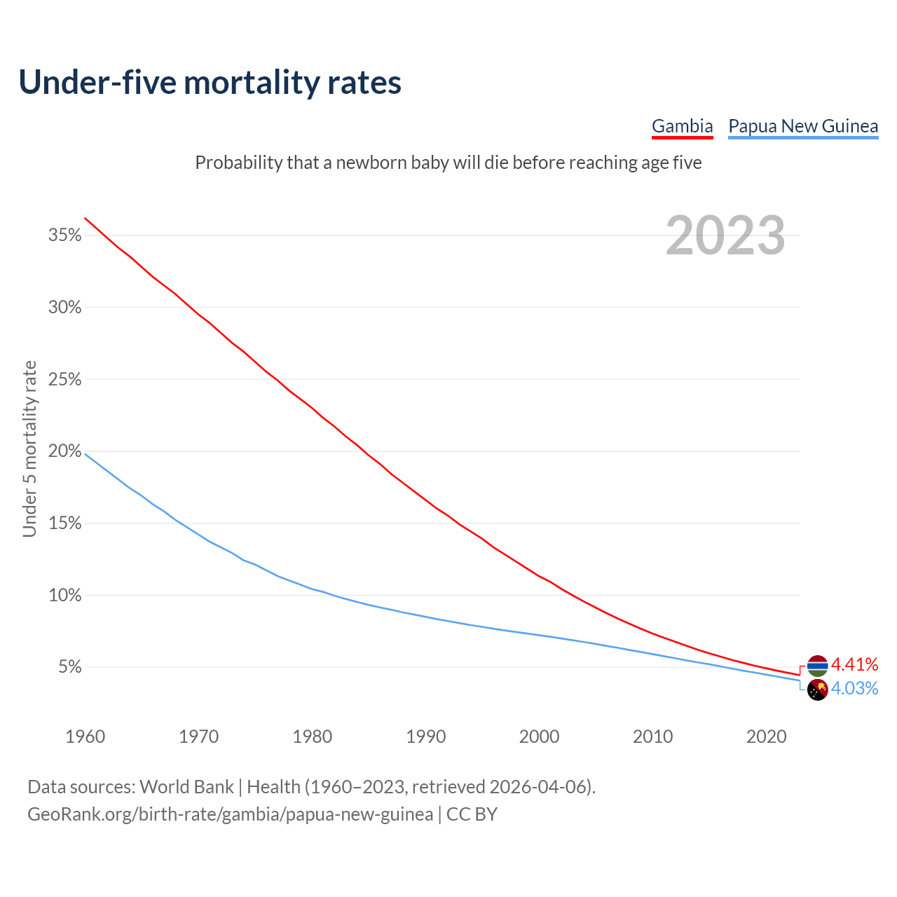 The chance that a newborn baby will die before reaching age five is 4.41% in the Gambia and 4.03% in Papua New Guinea. Above is a chart with historical data on under-five mortality rates.