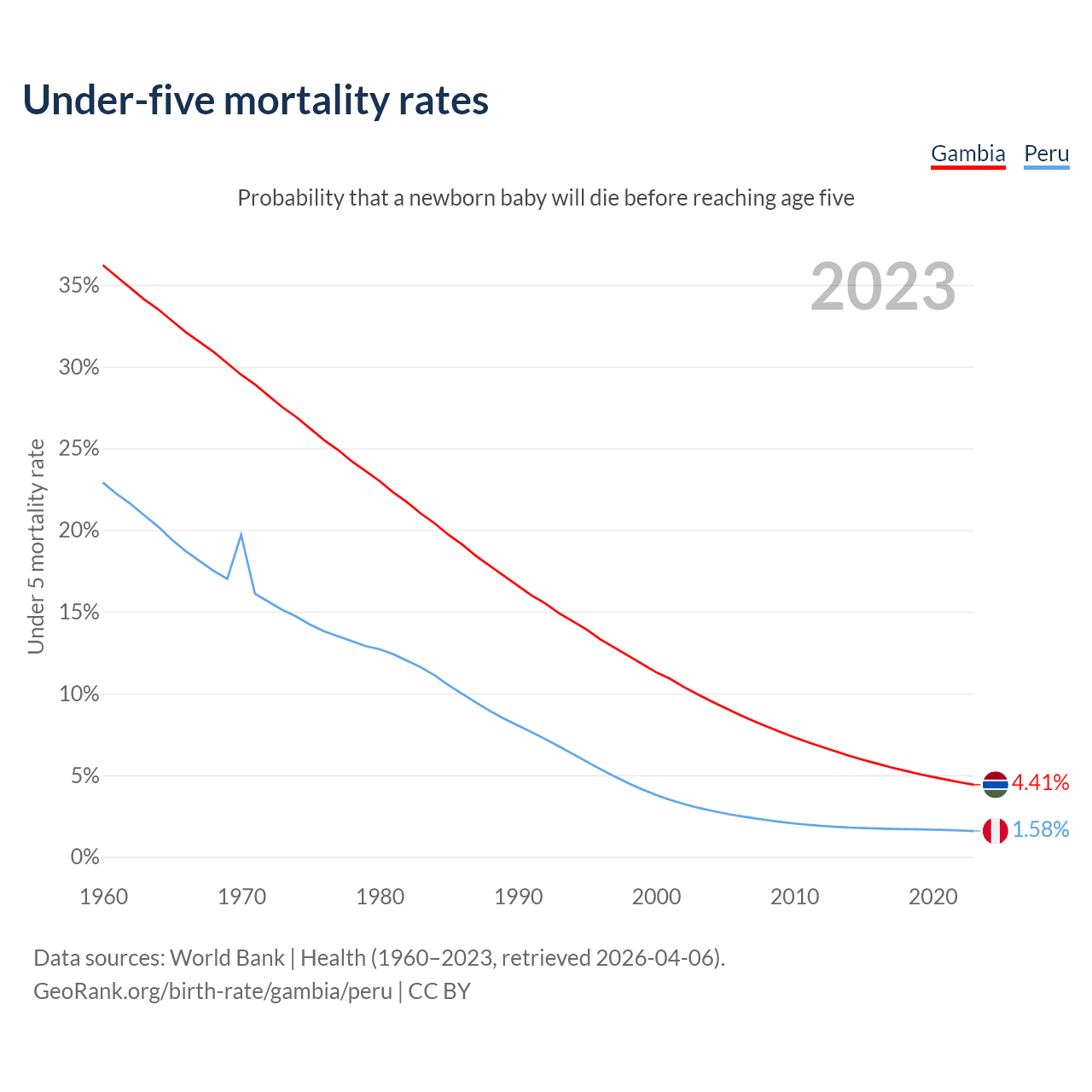 The chance that a newborn baby will die before reaching age five is 4.41% in the Gambia and 1.58% in Peru. Above is a chart with historical data on under-five mortality rates.
