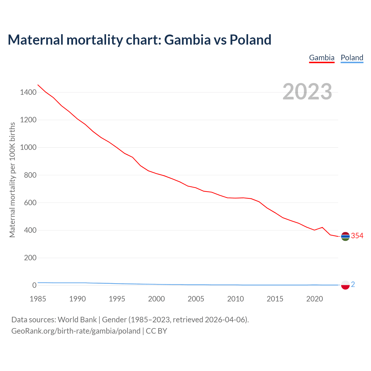 The maternal mortality rate, which is the probability of dying during childbirth or within 42 days of pregnancy termination, is 354 deaths per 100,000 live births in the Gambia, compared to 2 deaths in Poland.
