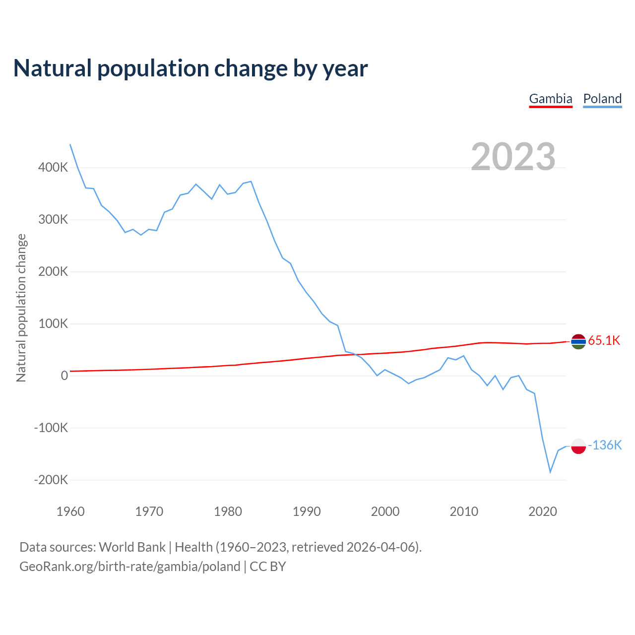 The Gambia has an annual birth rate of 30.4 births per 1,000 people, compared to 7.4 for Poland. The average number of children a woman is expected to have during her lifetime — the fertility rate, is 4.01 in the Gambia and 1.16 in Poland — 71.1% difference.