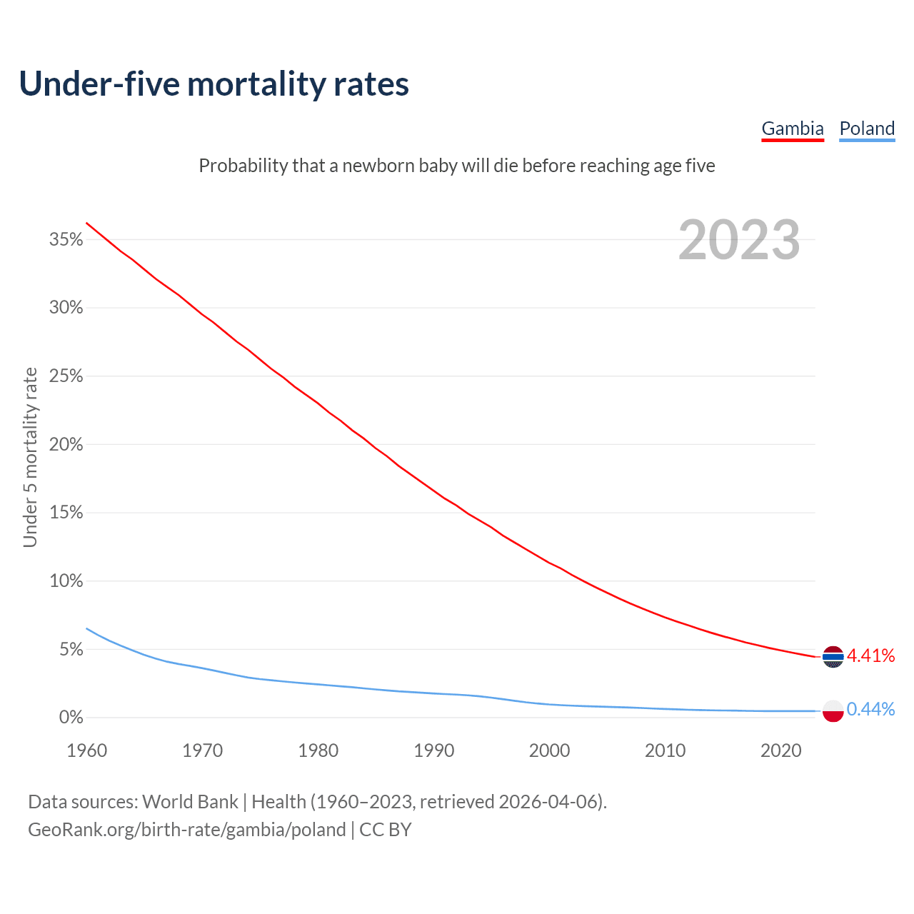 The chance that a newborn baby will die before reaching age five is 4.41% in the Gambia and 0.44% in Poland. Above is a chart with historical data on under-five mortality rates.