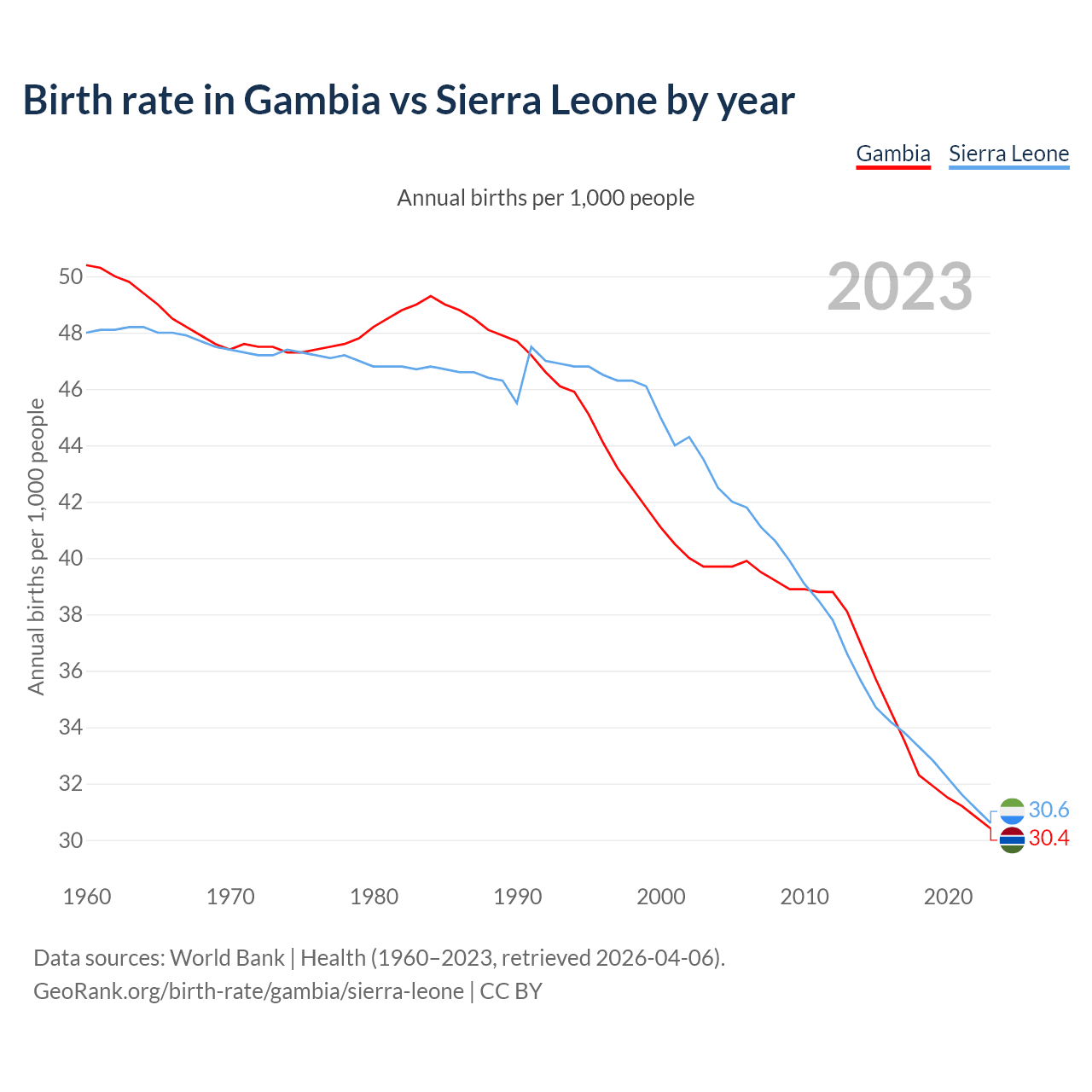 The Gambia has an annual birth rate of 30.4 births per 1,000 people, compared to 30.6 for Sierra Leone. The average number of children a woman is expected to have during her lifetime — the fertility rate, is 4.01 in the Gambia and 3.79 in Sierra Leone — 5.37% difference.