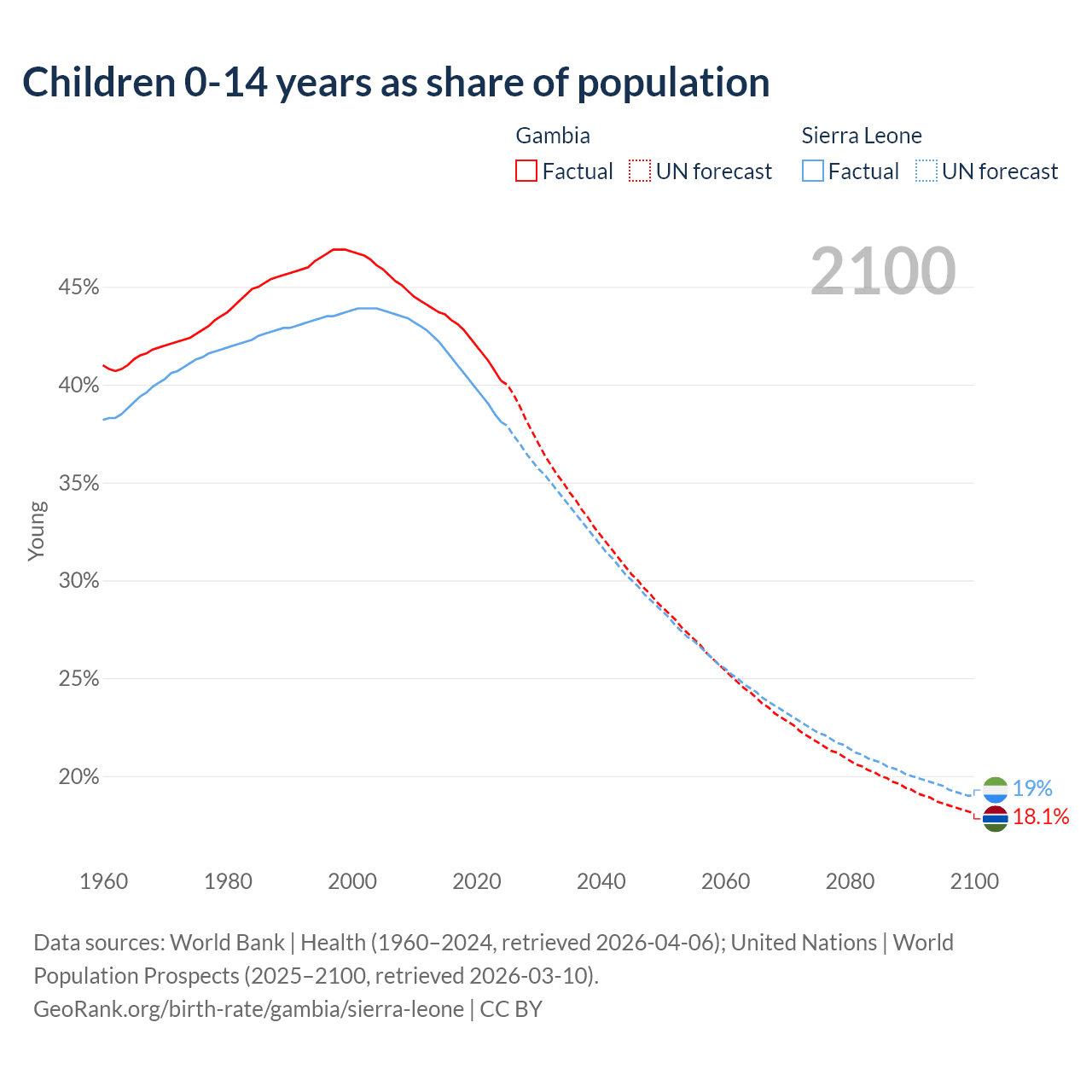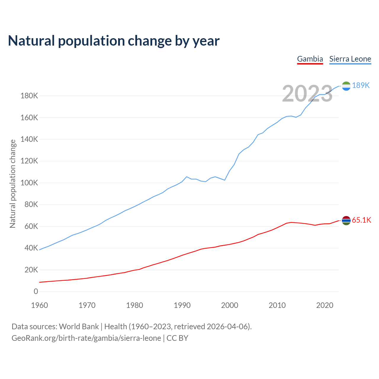 According to the latest available data on birth rates, the fertility rate in the Gambia was 4.01 children per woman in 2023, compared to 3.79 in Sierra Leone in 2023. The replacement level is considered to be 2.1 children per woman.