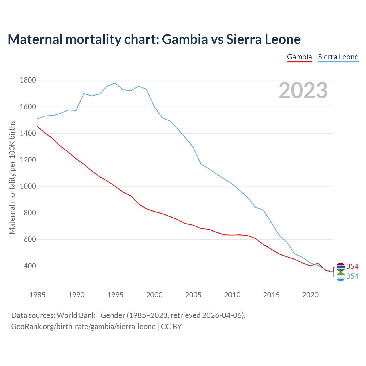 The maternal mortality rate, which is the probability of dying during childbirth or within 42 days of pregnancy termination, is 354 deaths per 100,000 live births in the Gambia, compared to 354 deaths in Sierra Leone.