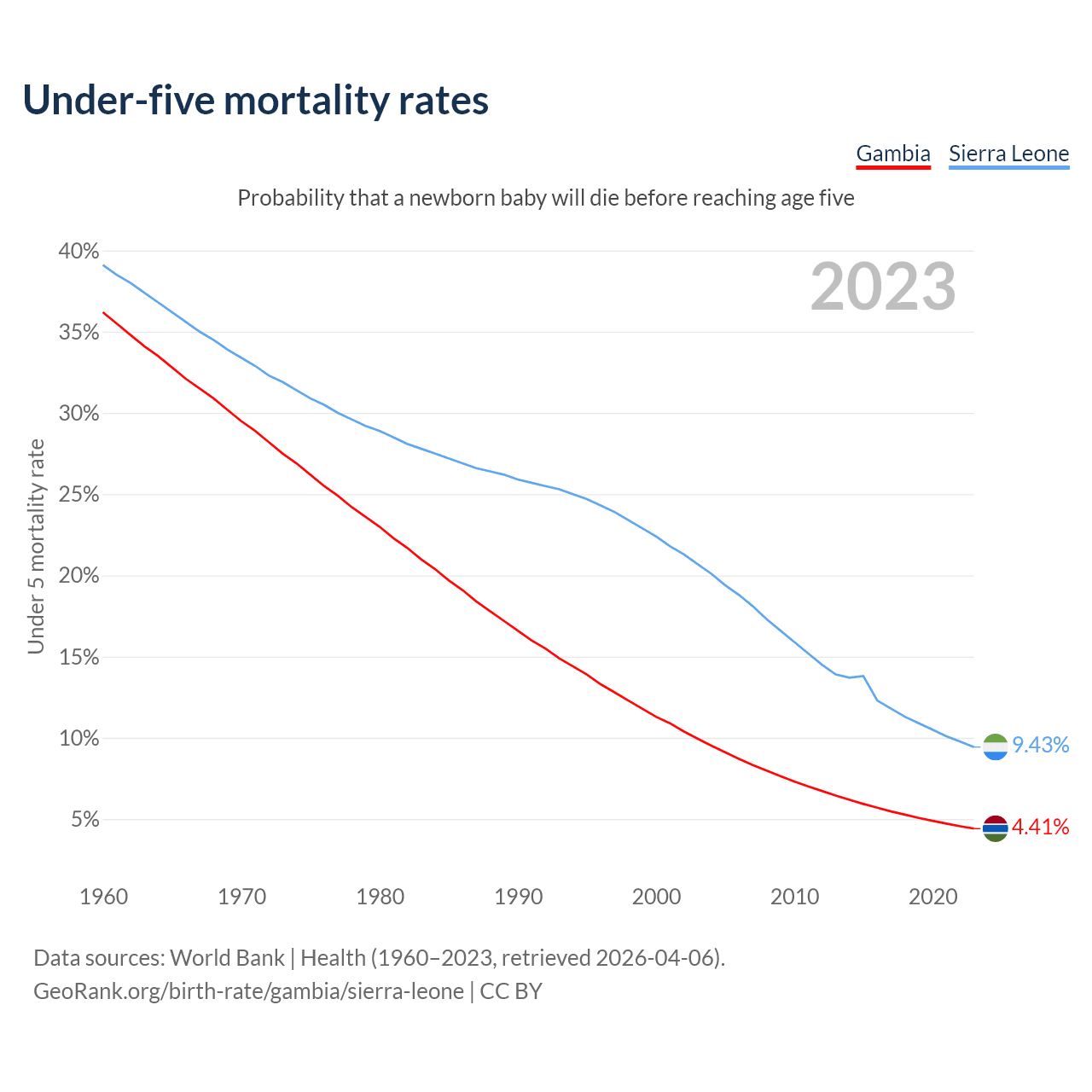 The chance that a newborn baby will die before reaching age five is 4.41% in the Gambia and 9.43% in Sierra Leone. Above is a chart with historical data on under-five mortality rates.