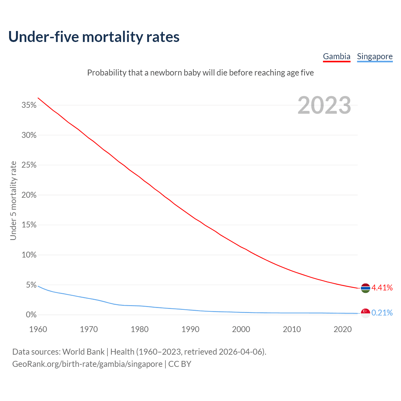 The chance that a newborn baby will die before reaching age five is 4.41% in the Gambia and 0.21% in Singapore. Above is a chart with historical data on under-five mortality rates.
