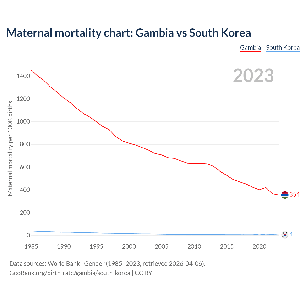The maternal mortality rate, which is the probability of dying during childbirth or within 42 days of pregnancy termination, is 354 deaths per 100,000 live births in the Gambia, compared to 4 deaths in South Korea.