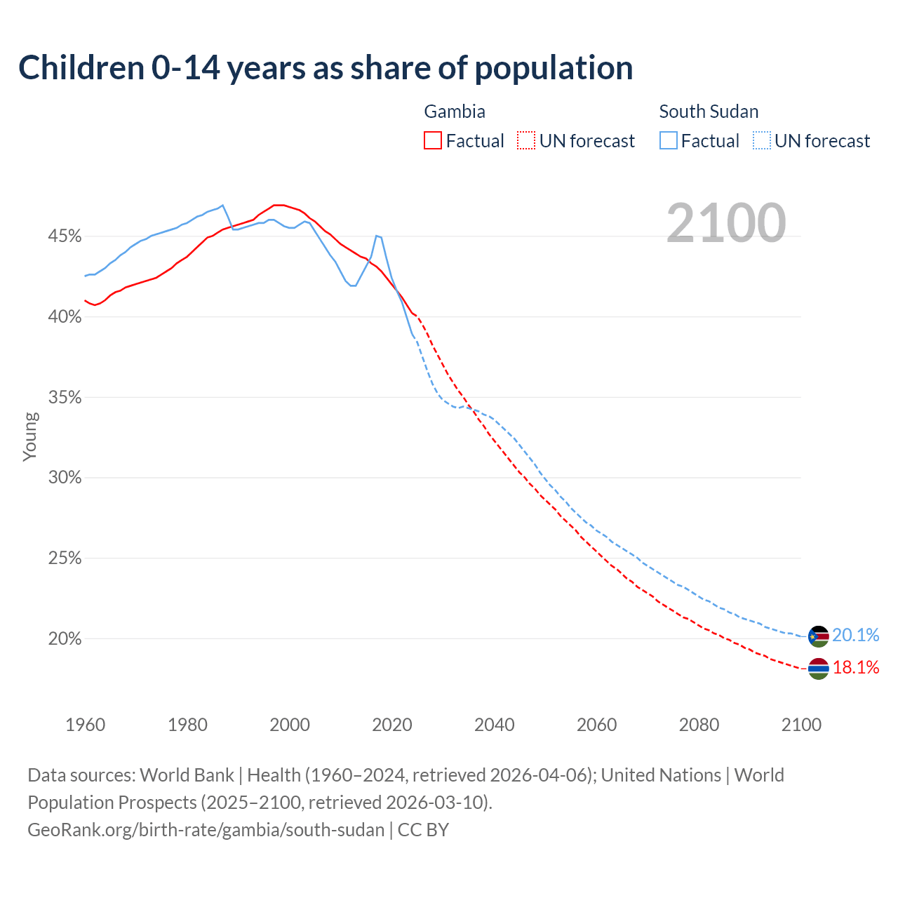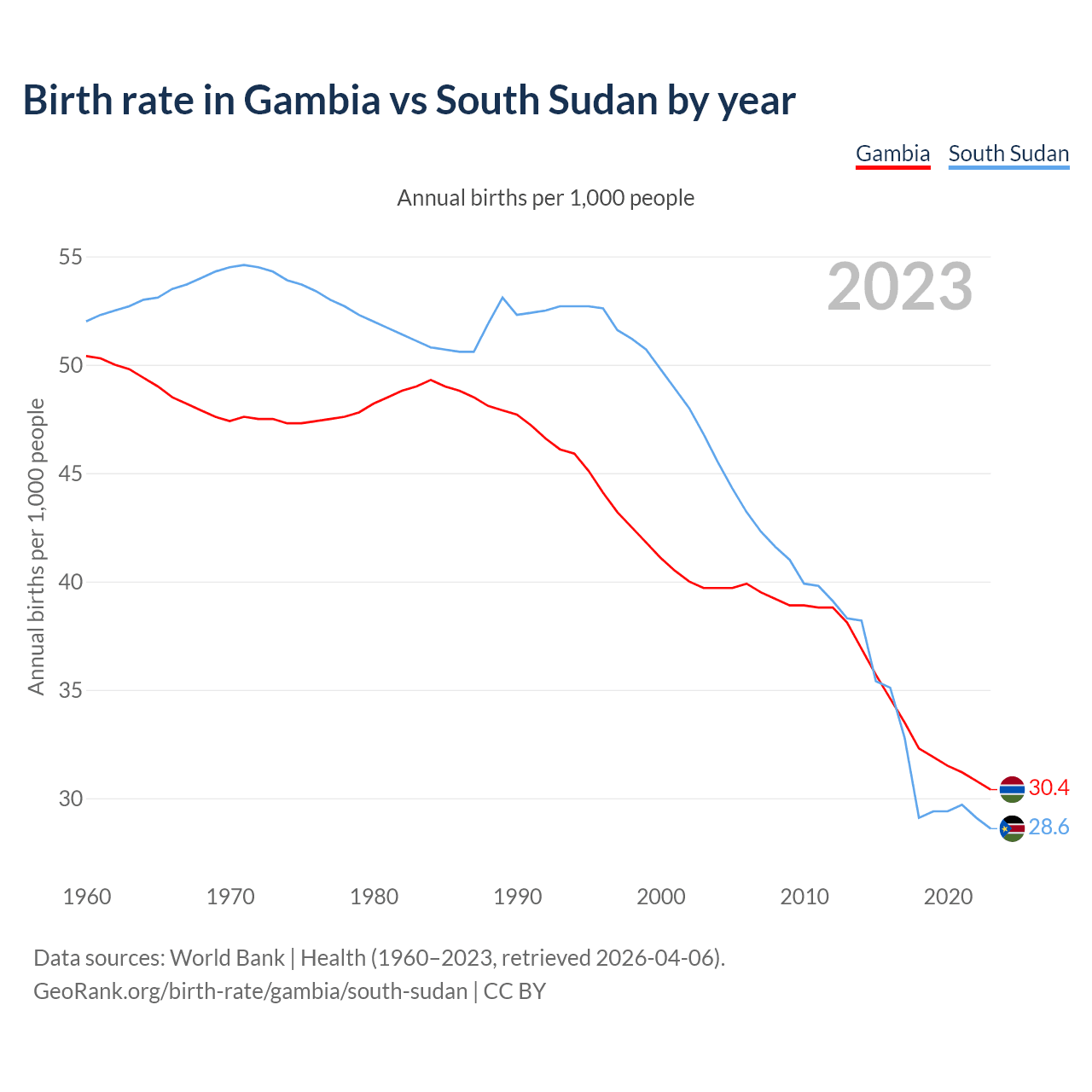 According to the latest available data on birth rates, the fertility rate in the Gambia was 4.01 children per woman in 2023, compared to 3.86 in South Sudan in 2023. The replacement level is considered to be 2.1 children per woman.