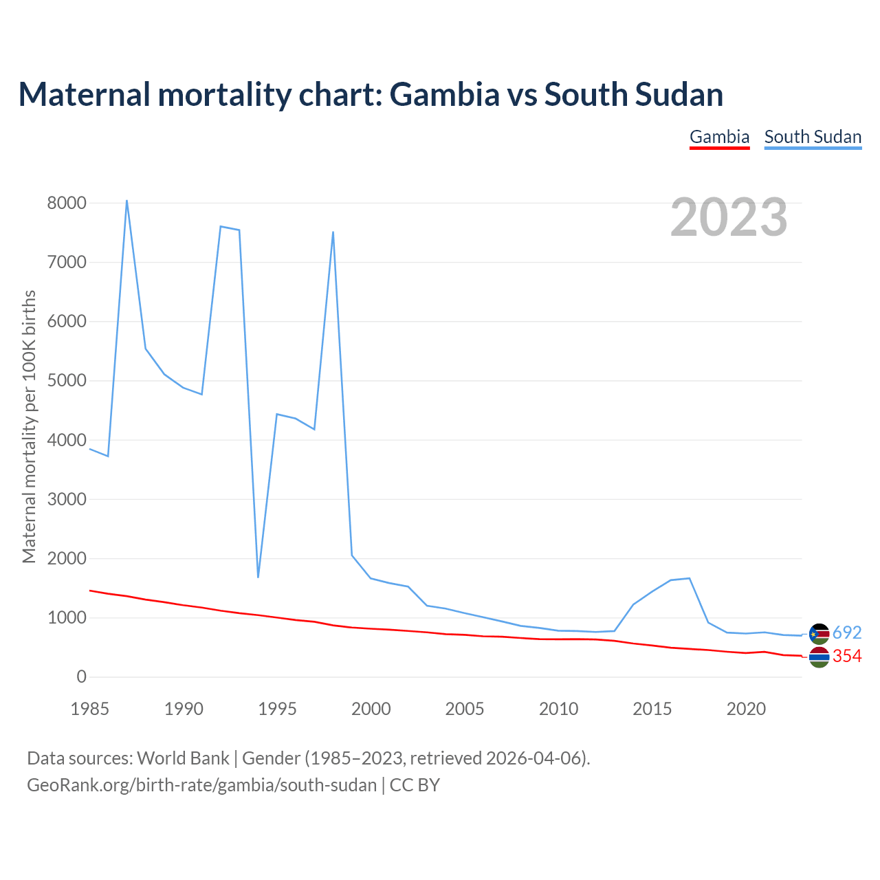 The maternal mortality rate, which is the probability of dying during childbirth or within 42 days of pregnancy termination, is 354 deaths per 100,000 live births in the Gambia, compared to 692 deaths in South Sudan.