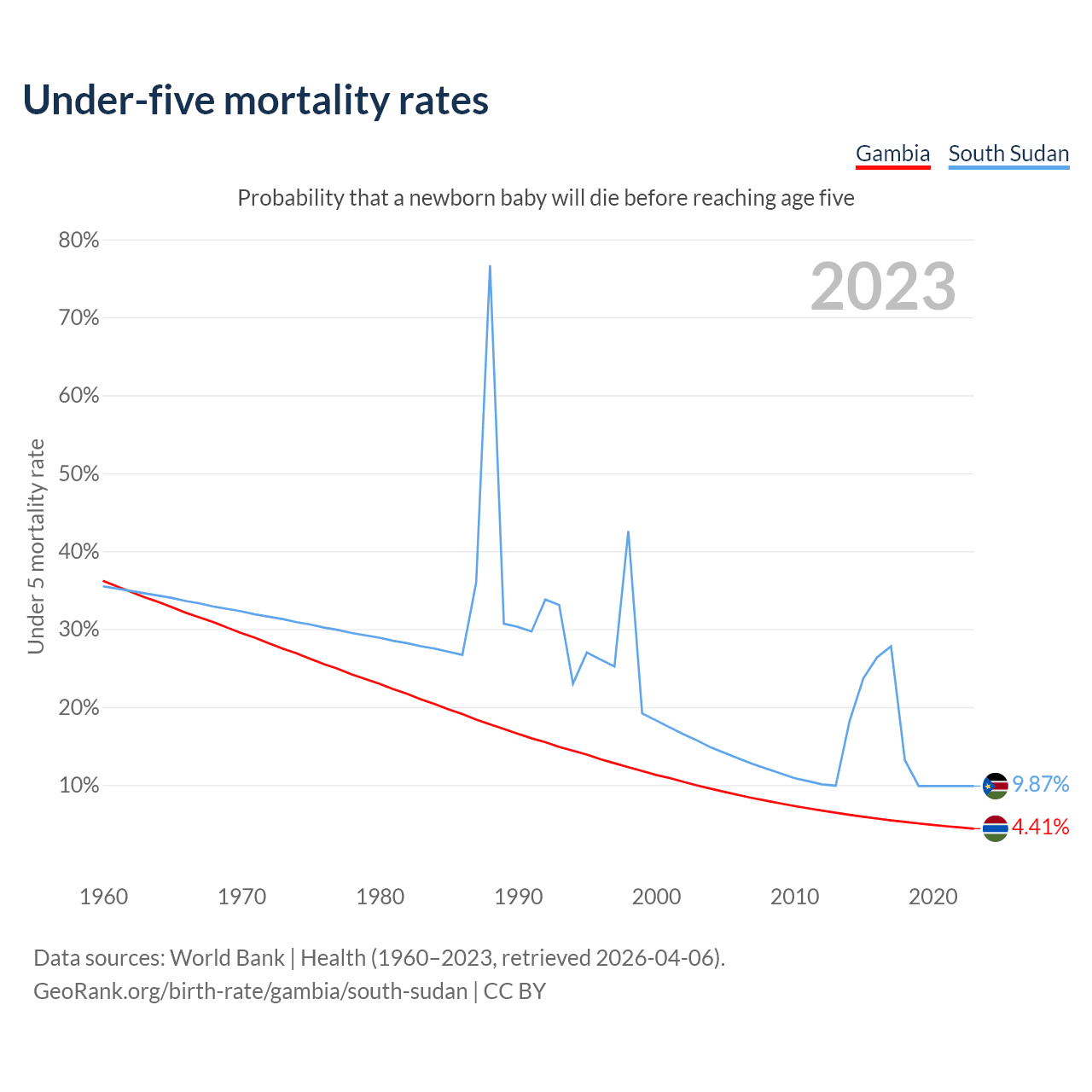 The chance that a newborn baby will die before reaching age five is 4.41% in the Gambia and 9.87% in South Sudan. Above is a chart with historical data on under-five mortality rates.