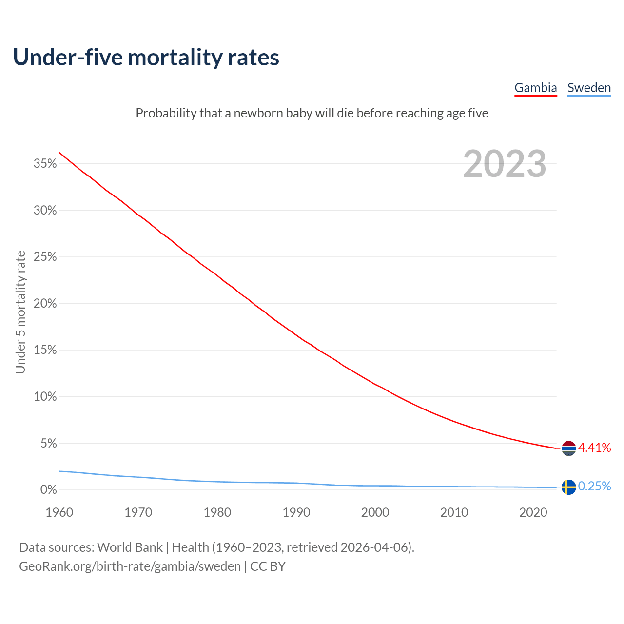 The chance that a newborn baby will die before reaching age five is 4.41% in the Gambia and 0.25% in Sweden. Above is a chart with historical data on under-five mortality rates.