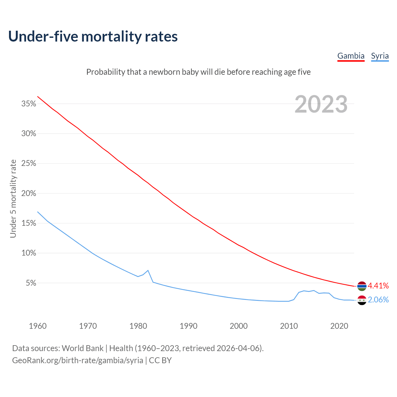 The chance that a newborn baby will die before reaching age five is 4.41% in the Gambia and 2.06% in Syria. Above is a chart with historical data on under-five mortality rates.