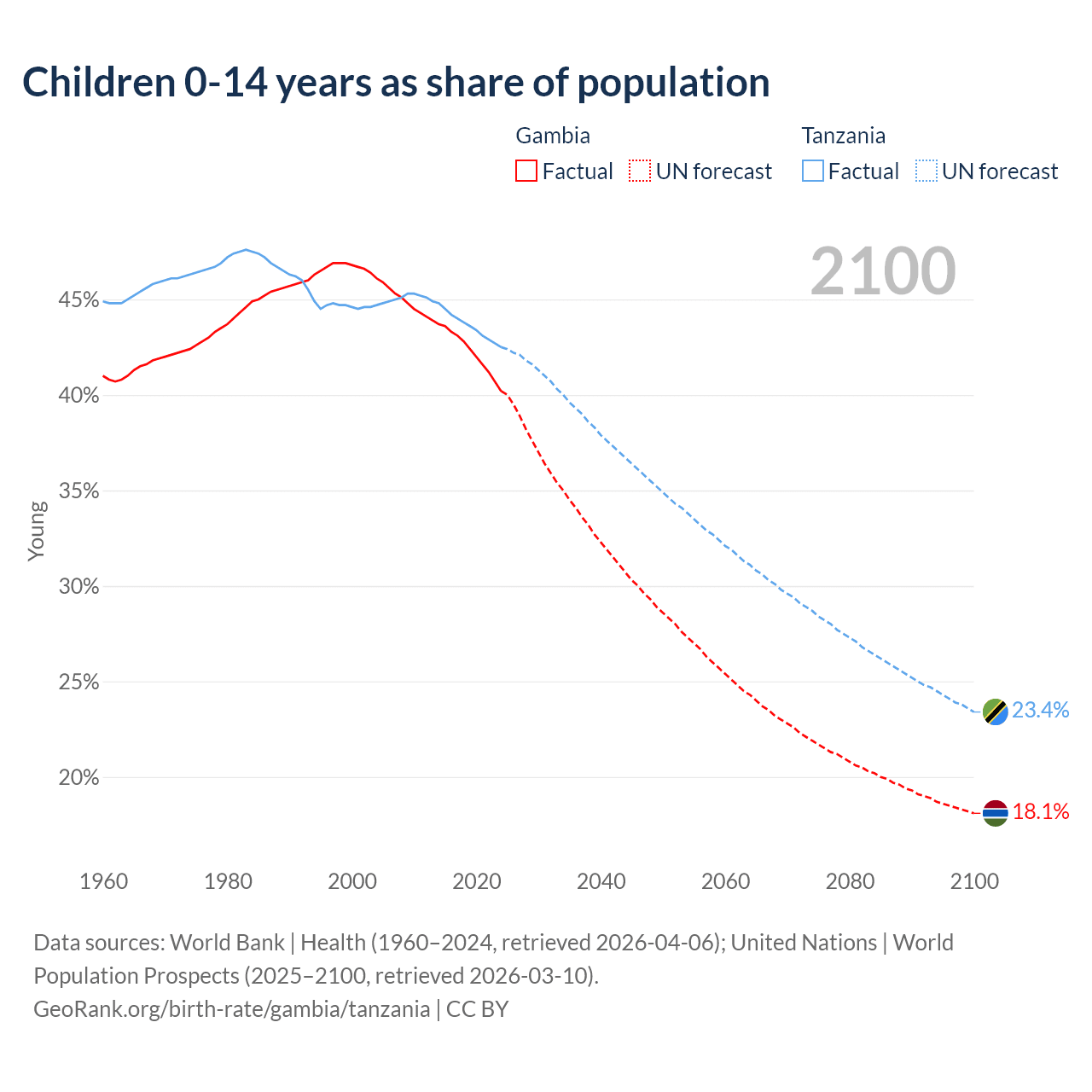 According to the latest available data on birth rates, the fertility rate in the Gambia was 4.01 children per woman in 2023, compared to 4.61 in Tanzania in 2023. The replacement level is considered to be 2.1 children per woman.