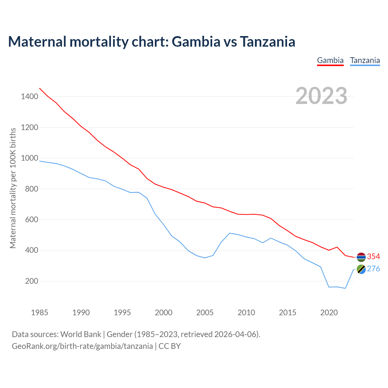 The maternal mortality rate, which is the probability of dying during childbirth or within 42 days of pregnancy termination, is 354 deaths per 100,000 live births in the Gambia, compared to 276 deaths in Tanzania.