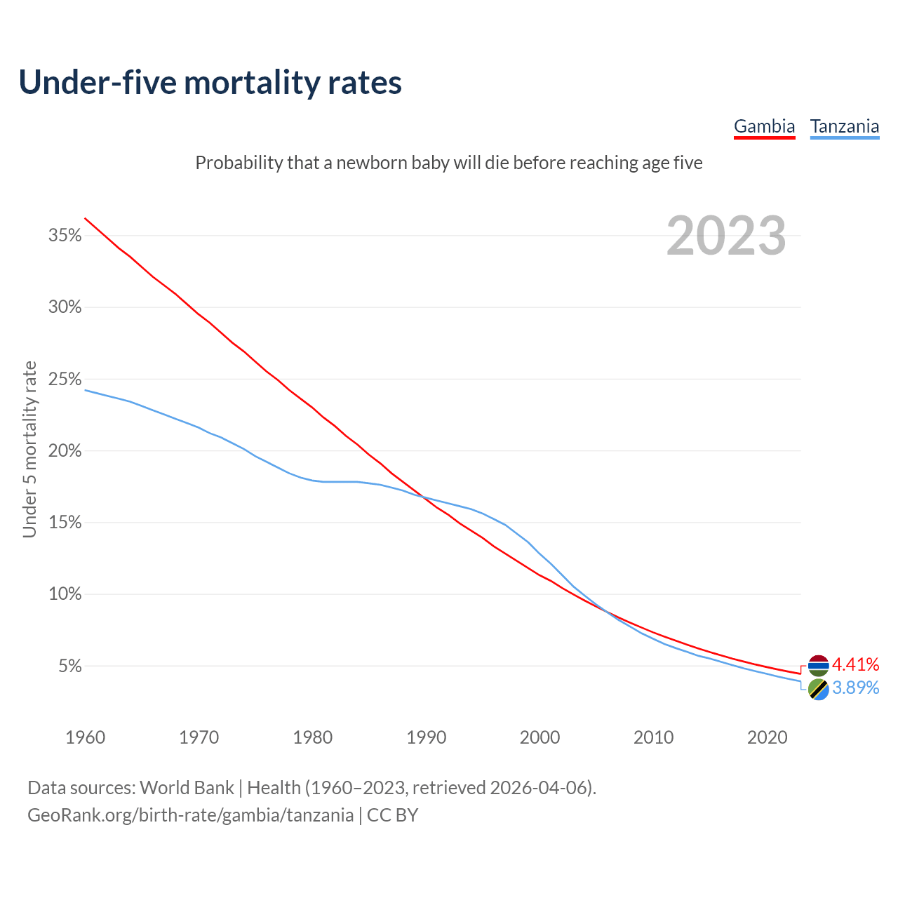 The chance that a newborn baby will die before reaching age five is 4.41% in the Gambia and 3.89% in Tanzania. Above is a chart with historical data on under-five mortality rates.