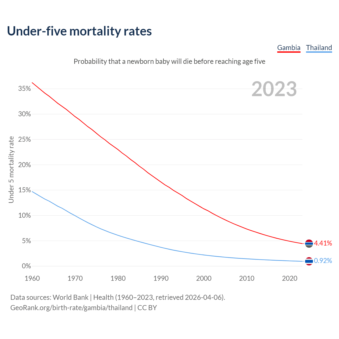 The chance that a newborn baby will die before reaching age five is 4.41% in the Gambia and 0.92% in Thailand. Above is a chart with historical data on under-five mortality rates.