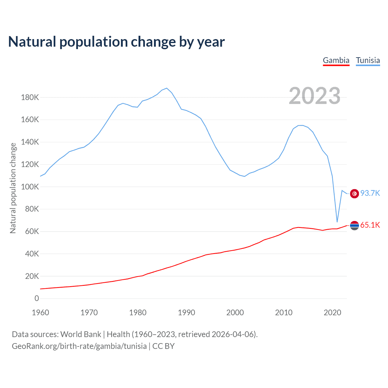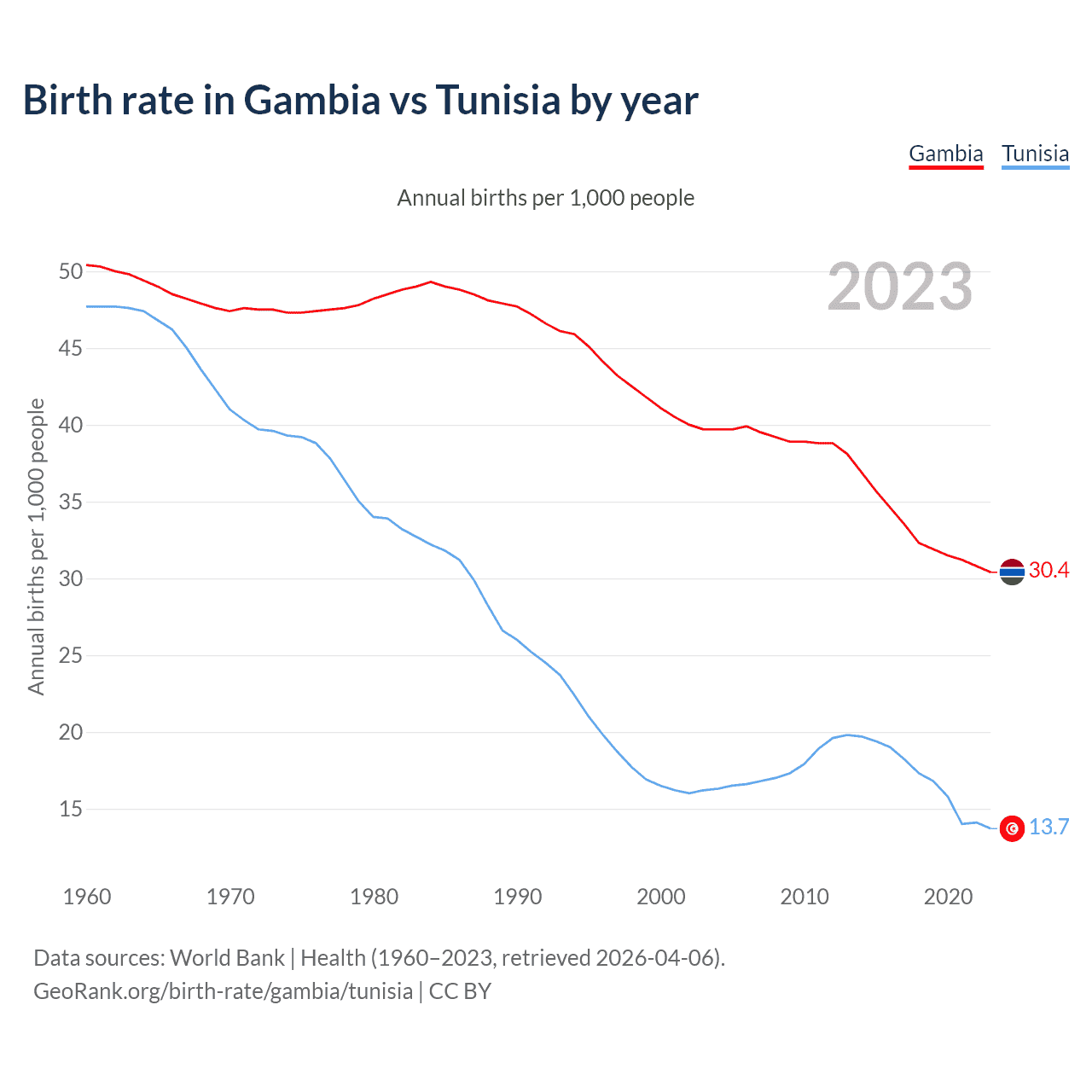 The Gambia has an annual birth rate of 30.4 births per 1,000 people, compared to 13.7 for Tunisia. The average number of children a woman is expected to have during her lifetime — the fertility rate, is 4.01 in the Gambia and 1.83 in Tunisia — 54.3% difference.