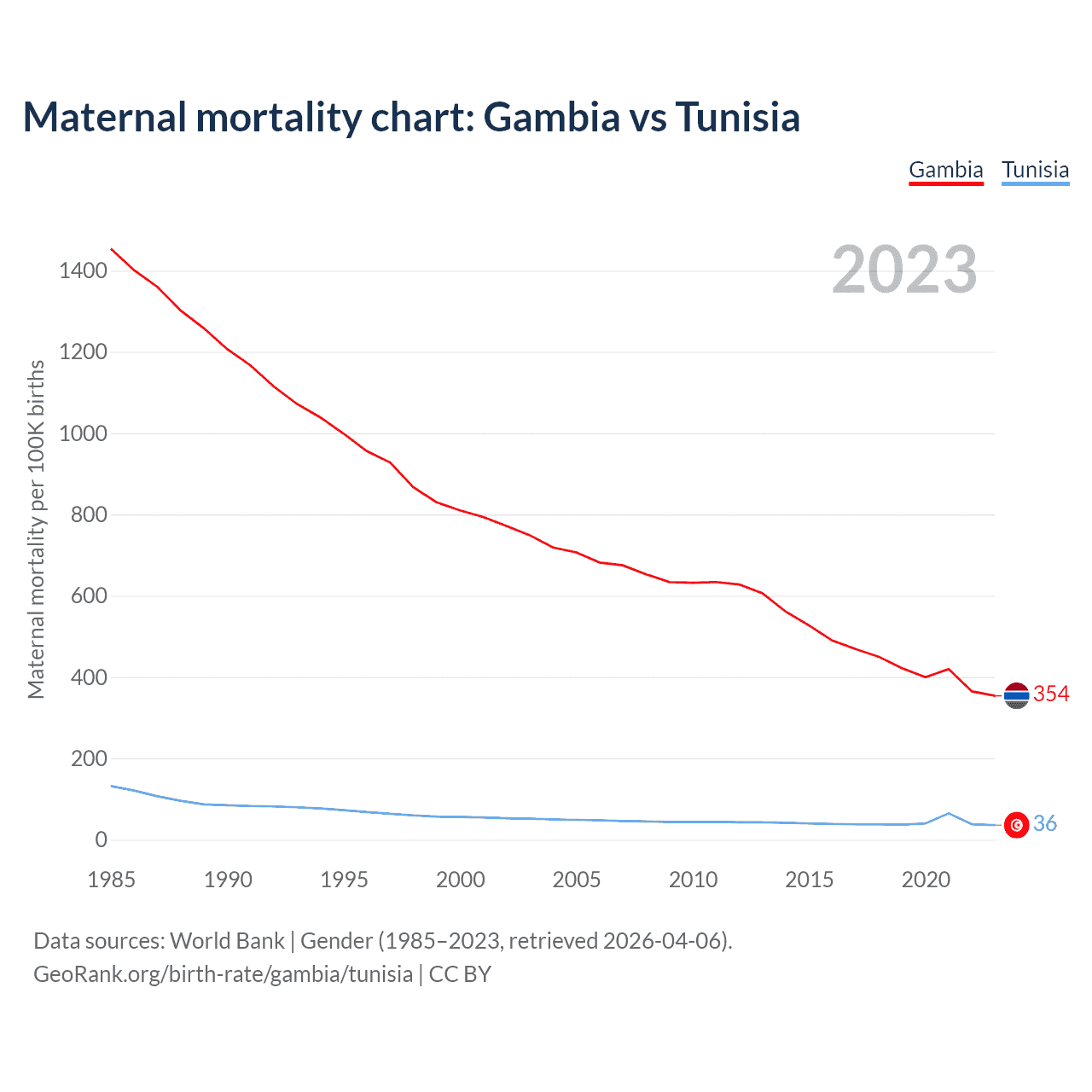 The maternal mortality rate, which is the probability of dying during childbirth or within 42 days of pregnancy termination, is 354 deaths per 100,000 live births in the Gambia, compared to 36 deaths in Tunisia.