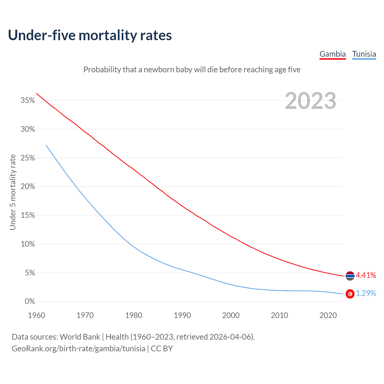 The chance that a newborn baby will die before reaching age five is 4.41% in the Gambia and 1.29% in Tunisia. Above is a chart with historical data on under-five mortality rates.