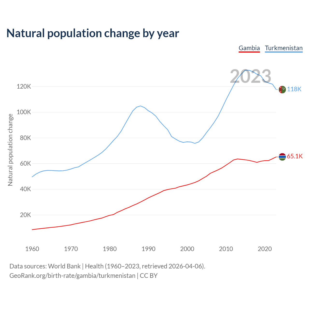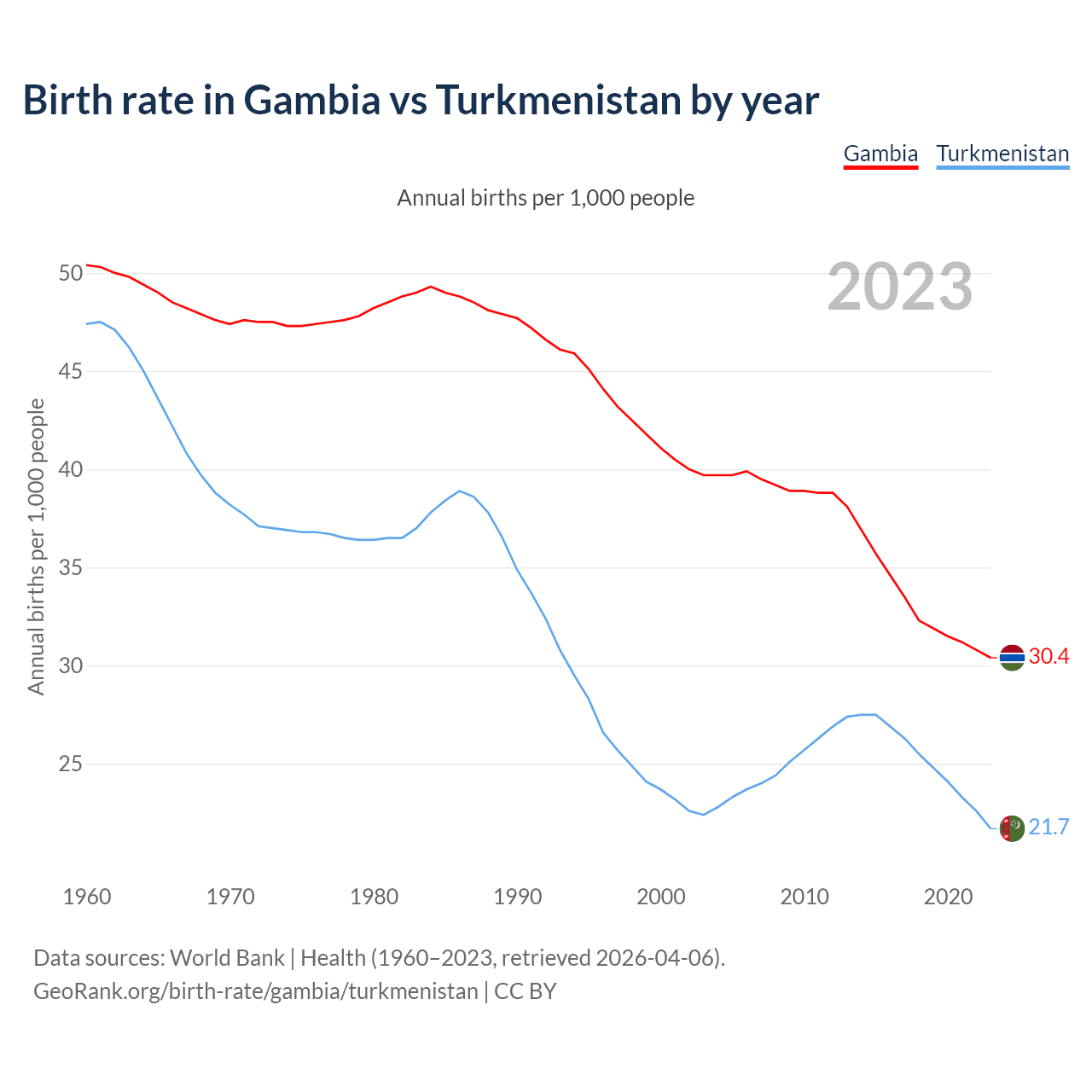 The Gambia has an annual birth rate of 30.4 births per 1,000 people, compared to 21.7 for Turkmenistan. The average number of children a woman is expected to have during her lifetime — the fertility rate, is 4.01 in the Gambia and 2.69 in Turkmenistan — 32.9% difference.