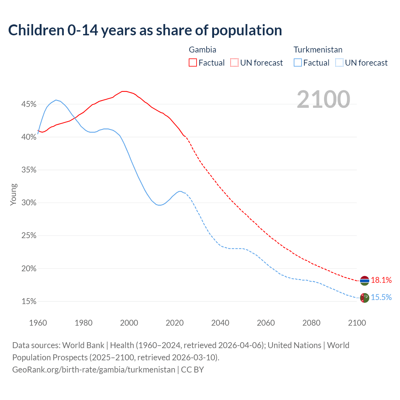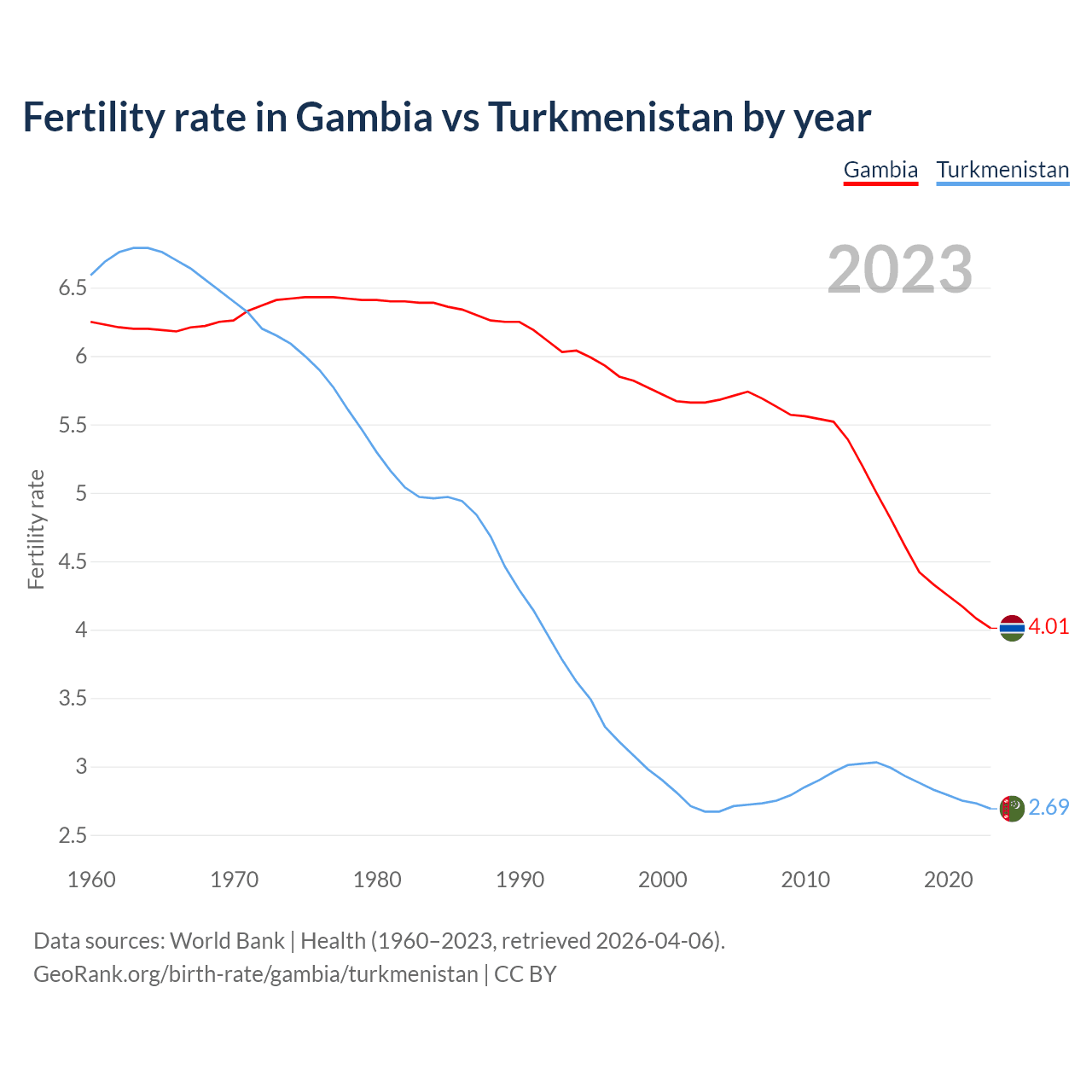 According to the latest available data on birth rates, the fertility rate in the Gambia was 4.01 children per woman in 2023, compared to 2.69 in Turkmenistan in 2023. The replacement level is considered to be 2.1 children per woman.