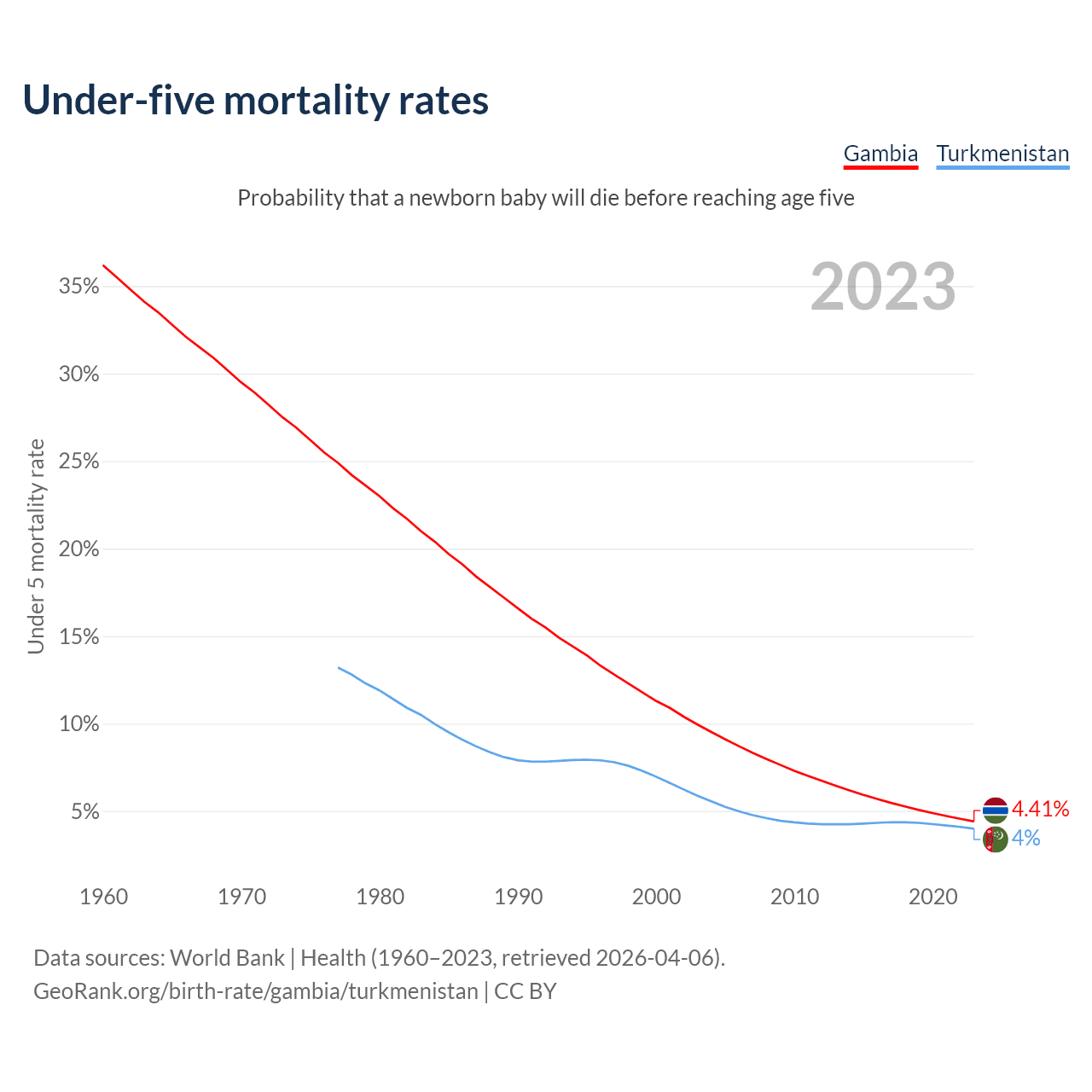 The chance that a newborn baby will die before reaching age five is 4.41% in the Gambia and 4% in Turkmenistan. Above is a chart with historical data on under-five mortality rates.