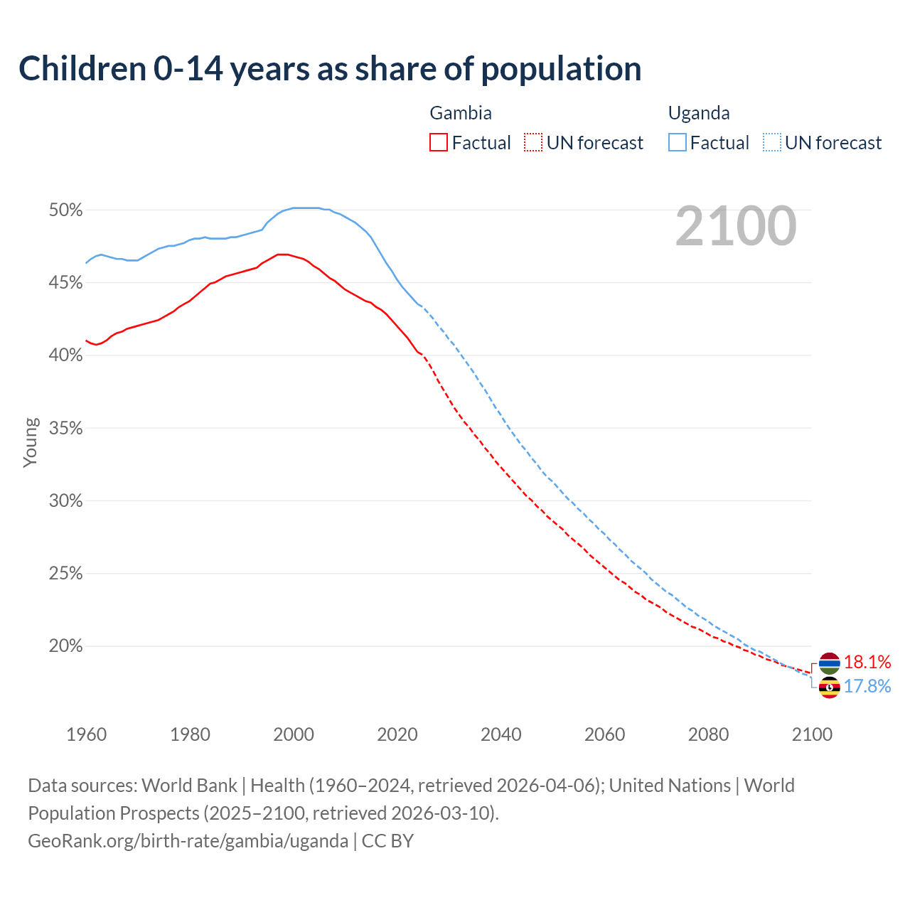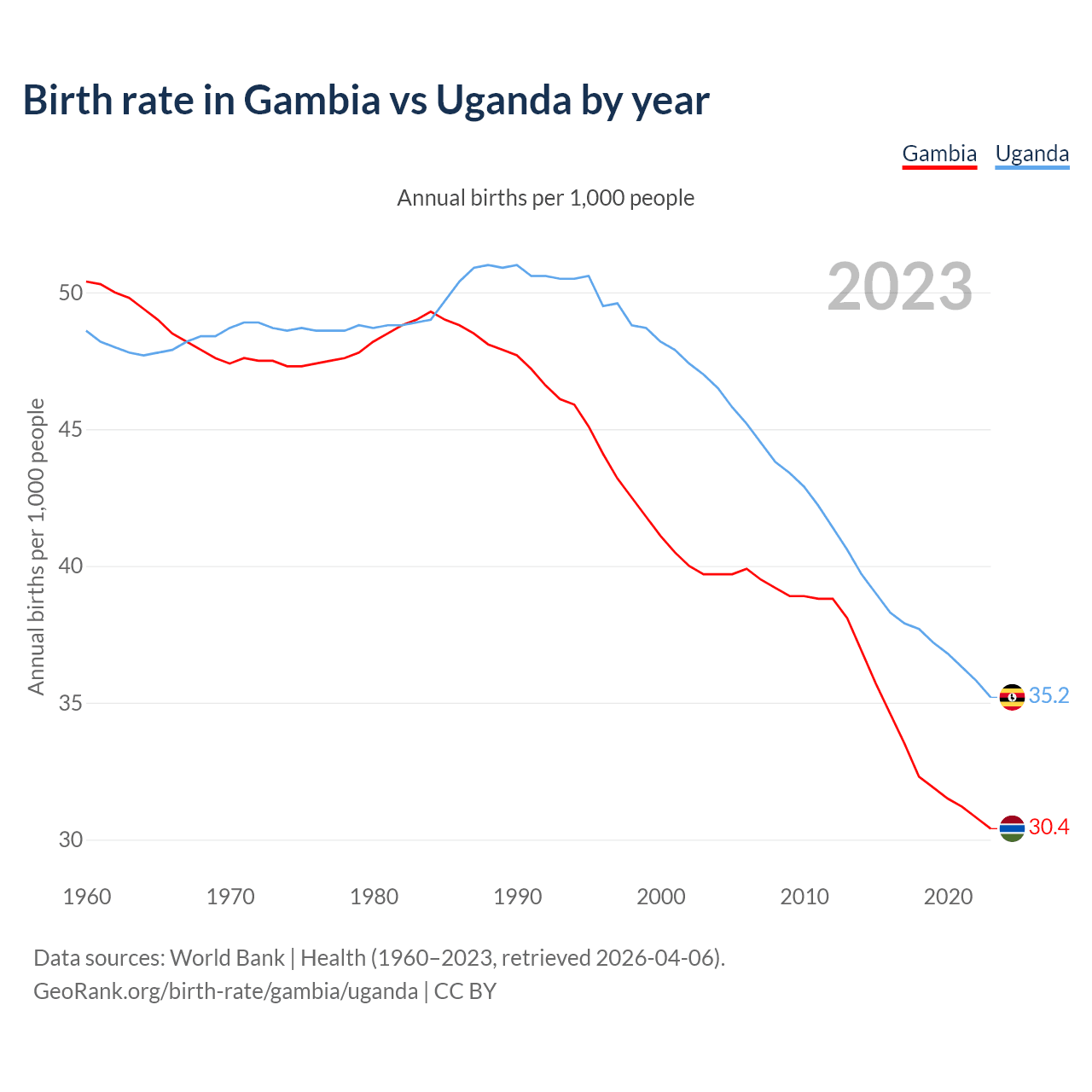 According to the latest available data on birth rates, the fertility rate in the Gambia was 4.01 children per woman in 2023, compared to 4.28 in Uganda in 2023. The replacement level is considered to be 2.1 children per woman.